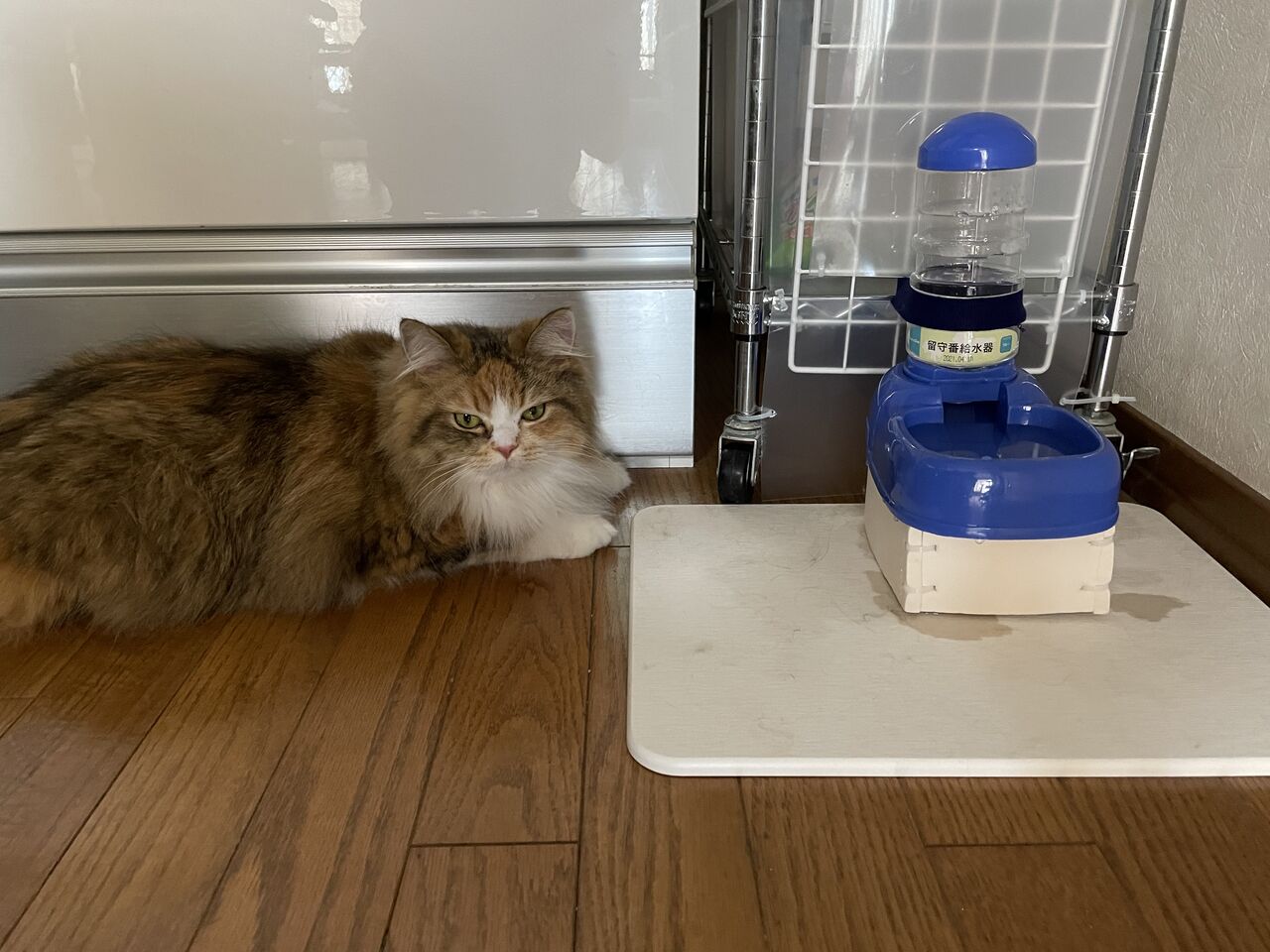 お留守番をさせるには、お水はとても大切。今2部屋に3ヶ所のお水をセットしている。お泊まり用にもう1ヶ所増やしたい。