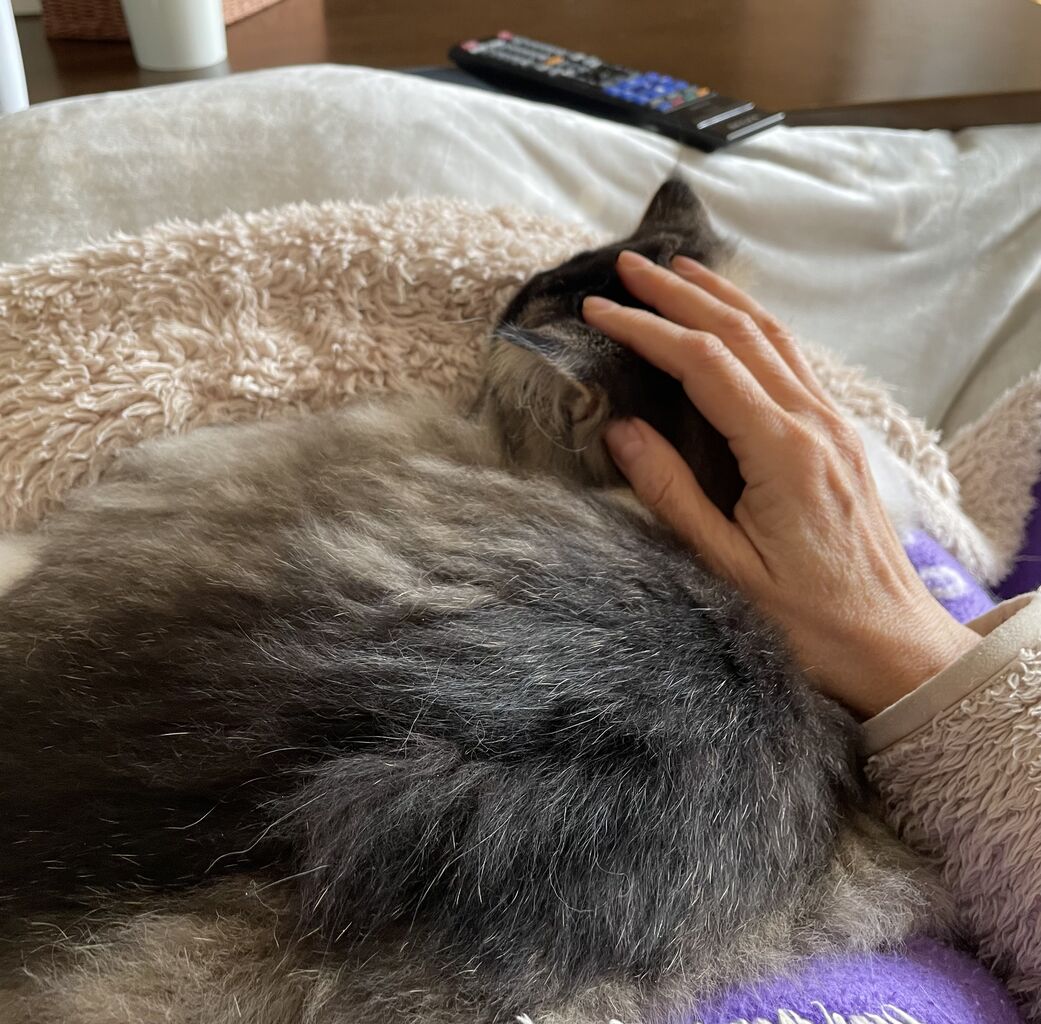 お昼ごはんのあと、テンちゃんは私のお腹の上へ。