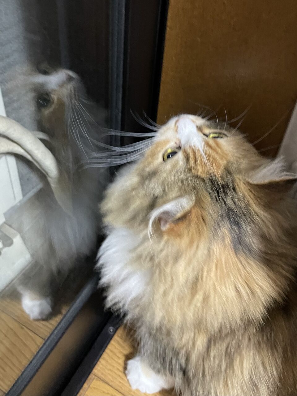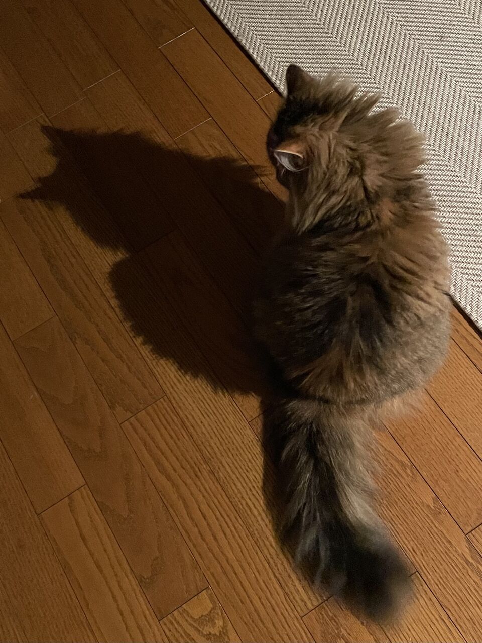 忘れ物を取りに行ってキッチンの電気をつけると、そこにもなぎが2匹。影のなぎにもちゃんとツノがある。