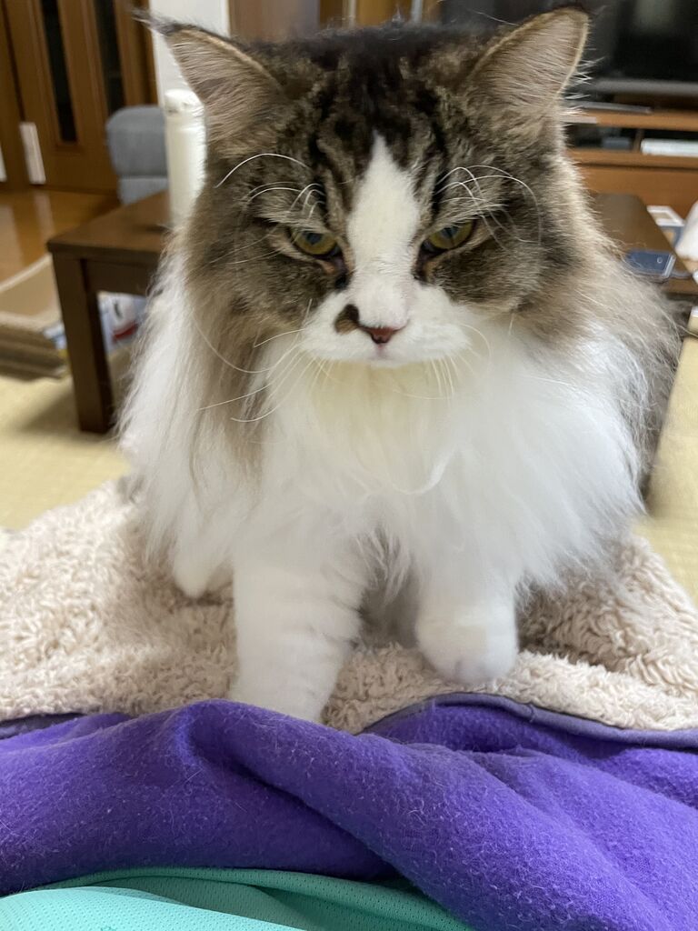 さっそく表フリース裏ボアの、テンちゃん愛用のひざ掛けを持ってきて膝にかけてみる。