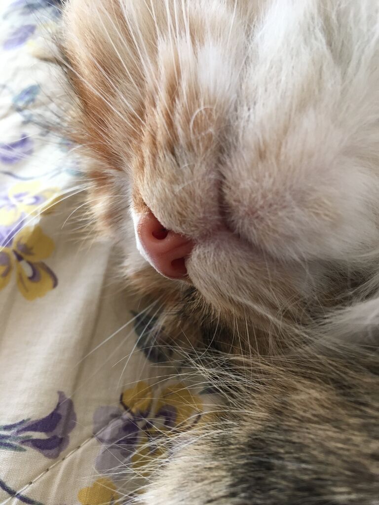 「無理やり添い寝だね」なんて言いながら、そのかわいい鼻を触ってみる。