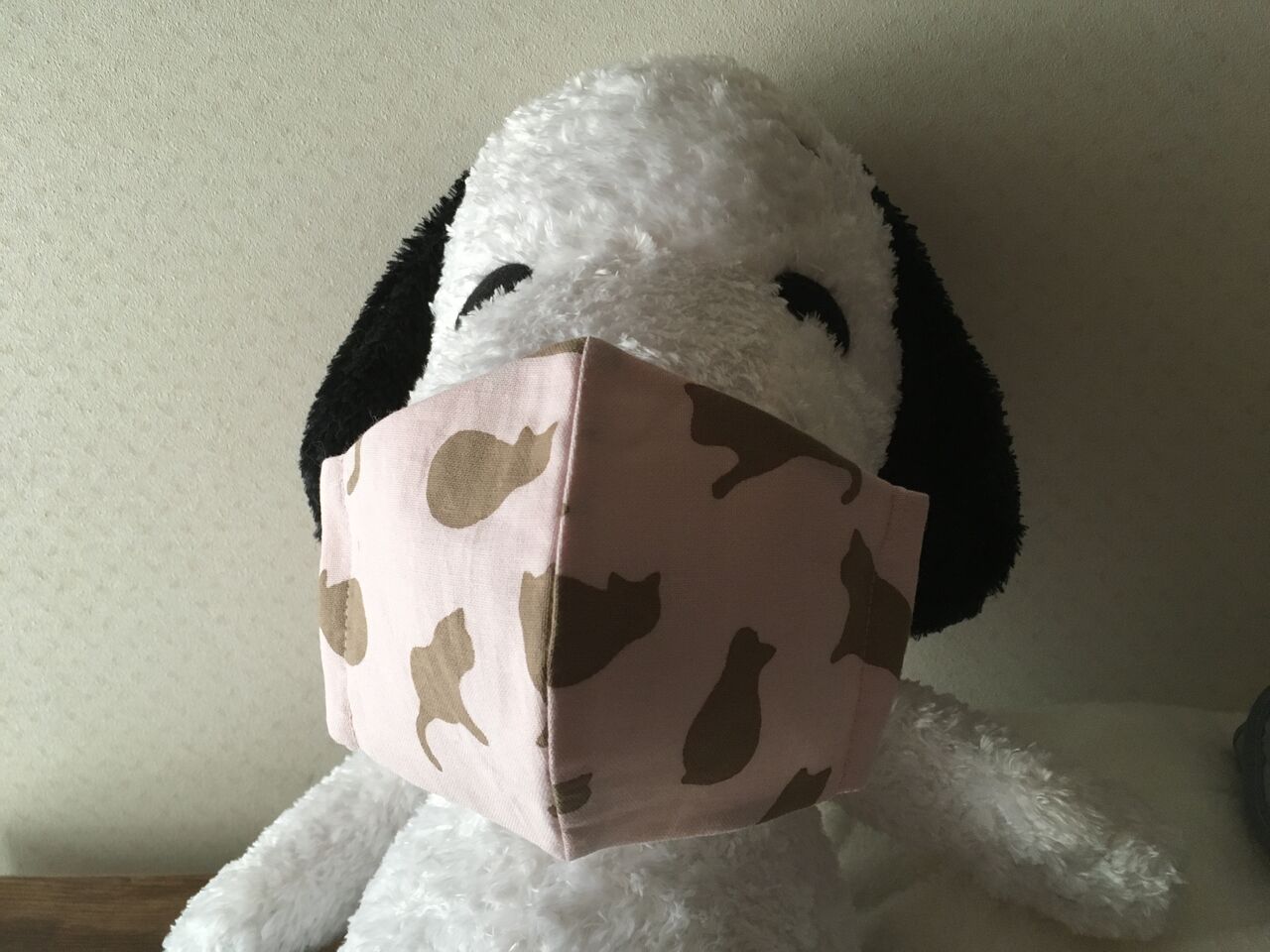 友人からのプレゼント「猫柄の手ぬぐいマスク」スヌーピーに試着してもらってます