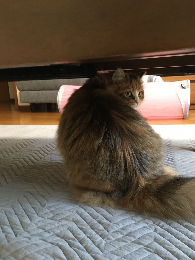 再びテーブルの下を歩くなぎ。大きくなったので、もう背伸びはしなくていい。