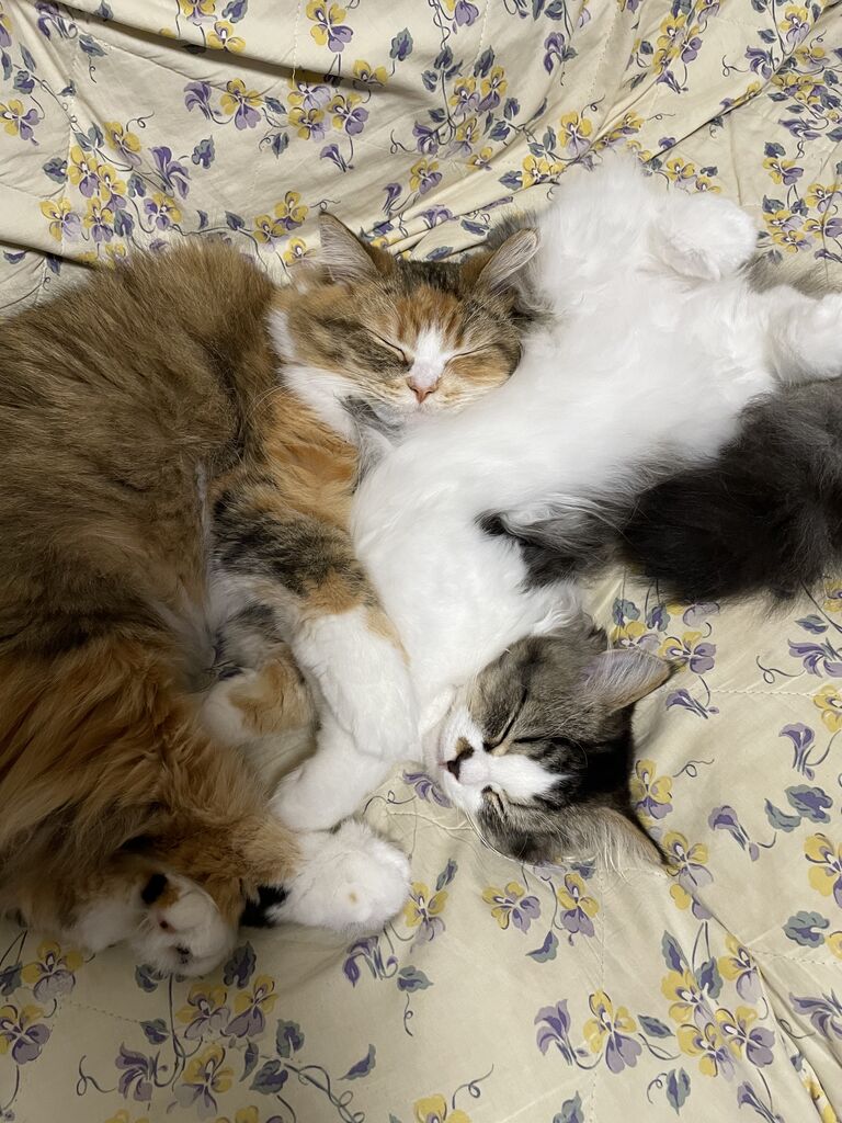テンちゃんはそこでお昼寝を開始。なぎもうつらうつらしているけれど、時々耳元で「ギュルギュル」という甘えたときの鳴き声を出す。