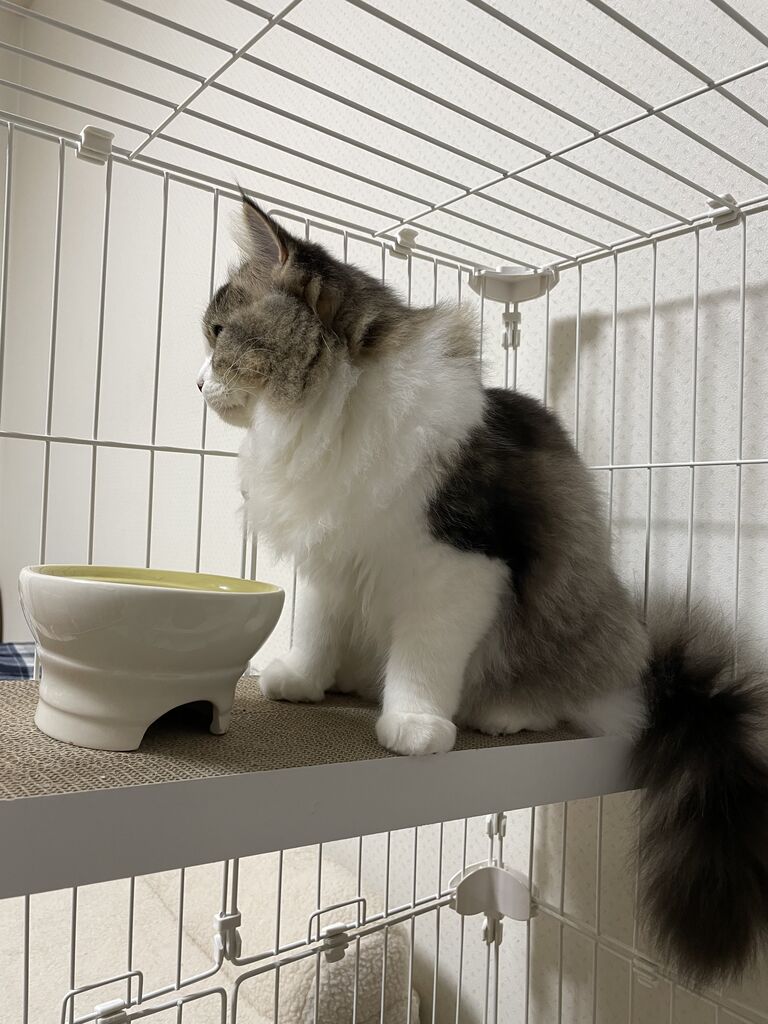 テンちゃんはごはんよりなぎが気になって、お皿から顔を上げ、座った姿勢のままなぎの気配を伺っている。それがごはん中何度も…