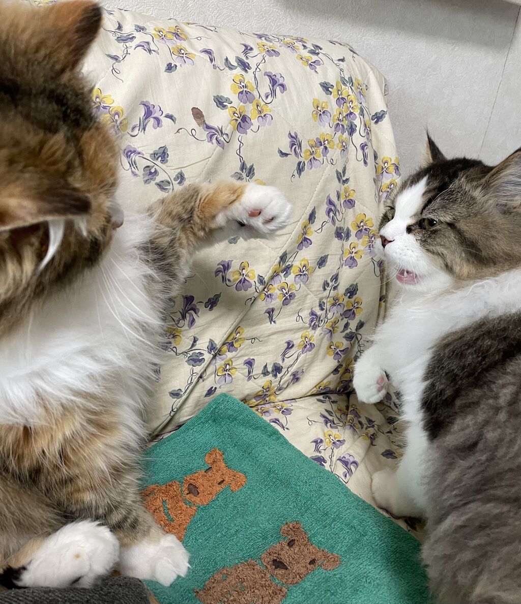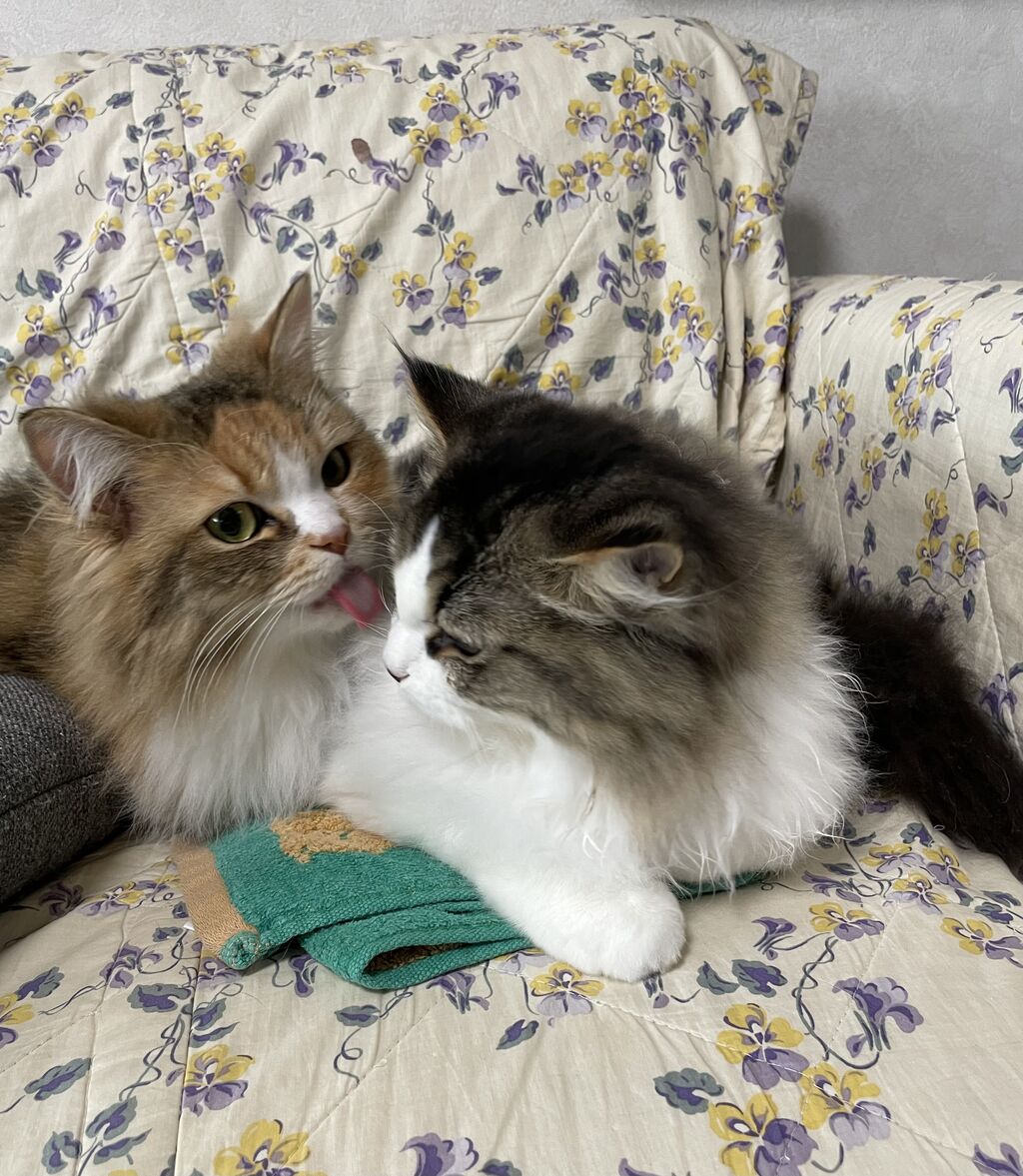 そこへお昼寝から起きたなぎがやってきて、テンちゃんを少しだけグルーミング。テンちゃんは目を閉じたまま。