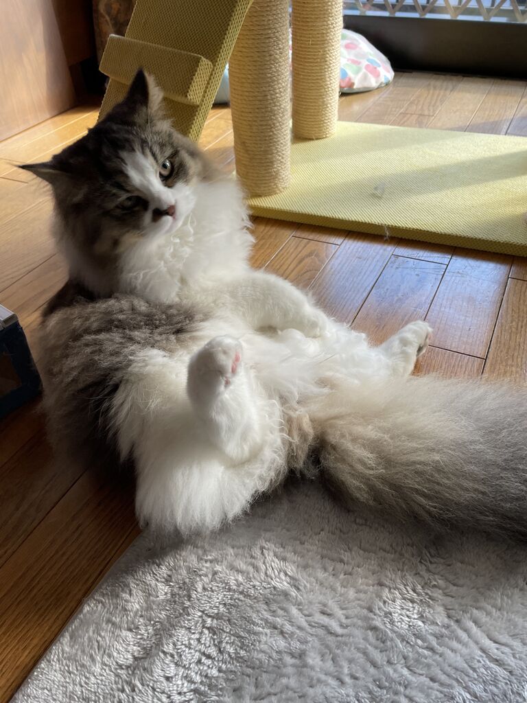 テンちゃんもお昼ごはんの後、キャットタワーで鳥を見たりお空を見たりしながらまどろんでいたけれど、大きく伸びをして下りてきた。