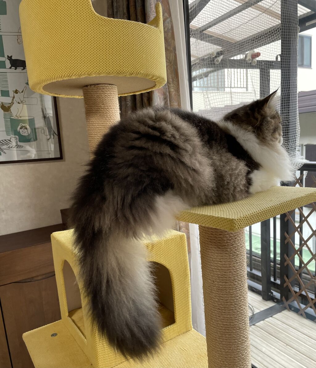 目を開けると、なぎはキャットタワーの上で外を見ている。テンちゃんはおもちゃと格闘中。