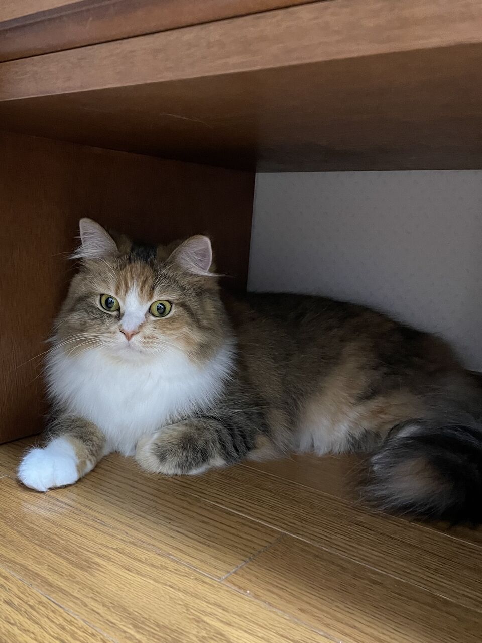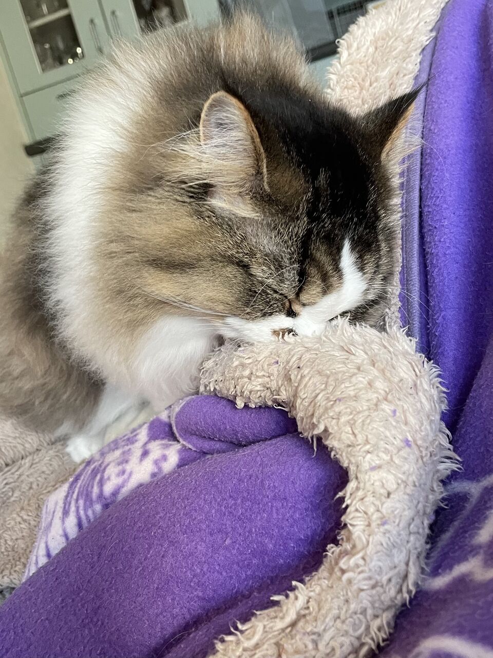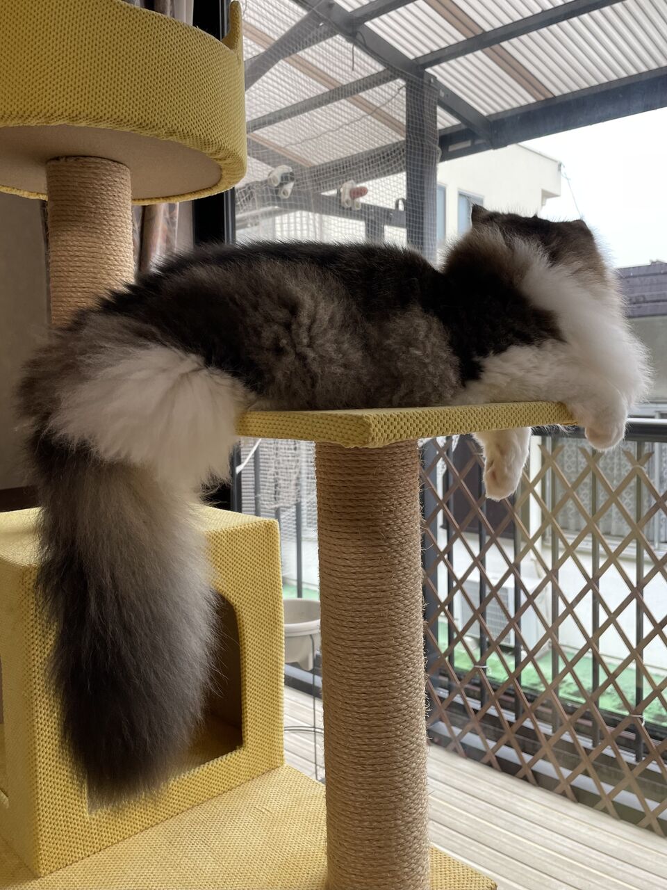 なぎはブラッシングが好きじゃないから、寝ているところへ行ってサッとブラッシンググローブで体を撫でる。なぎがはっきり目を覚まさないうちに「失礼しましたぁ!」と退散。