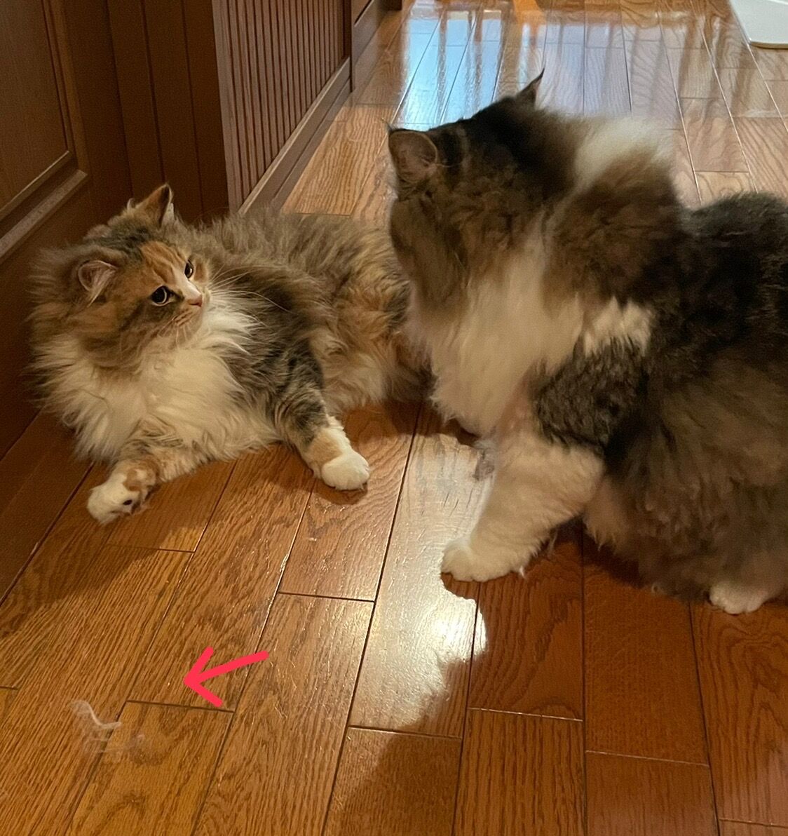 なぎテンが派手に戯れたあと、毛の塊があちらこちらに。「白いからテンちゃんのだ」「茶色もあるからなぎのも混ざってるよ」そんな会話をする飼い主たち。