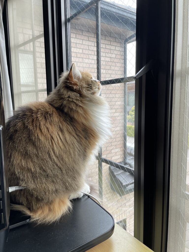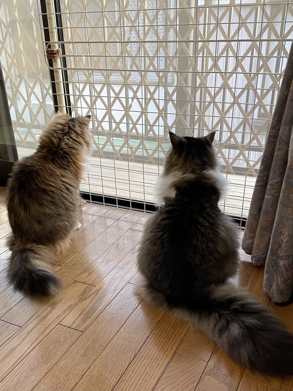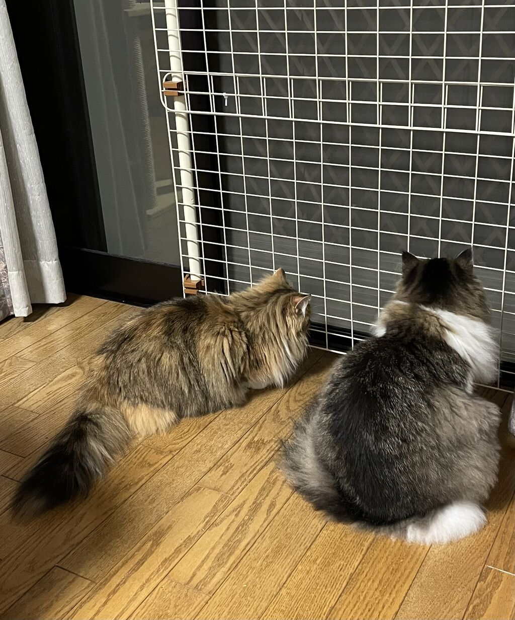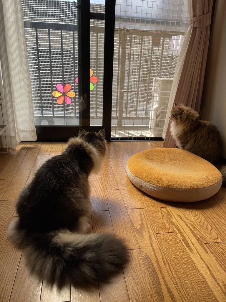 お外を見ているテンちゃん。そんなテンちゃんをグルーミングしようとなぎが近づいていくと、テンちゃんは「嫌だもん!」というように逃げていく。