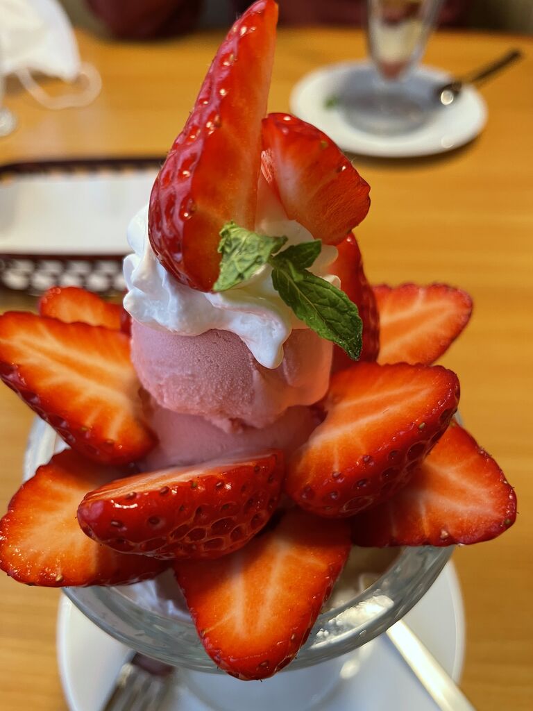 パフェや果物ジュースもいいのよね。今はイチゴ、夏はクラウンメロン。果物の品質がいいので、とってもお得なパフェやジュース。