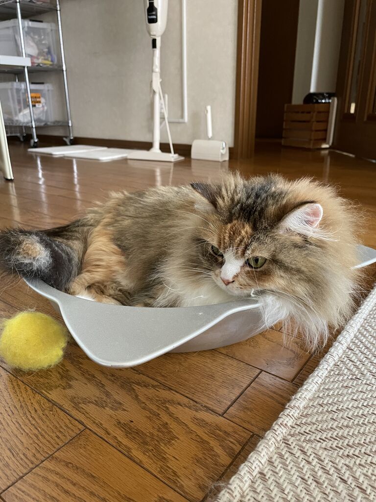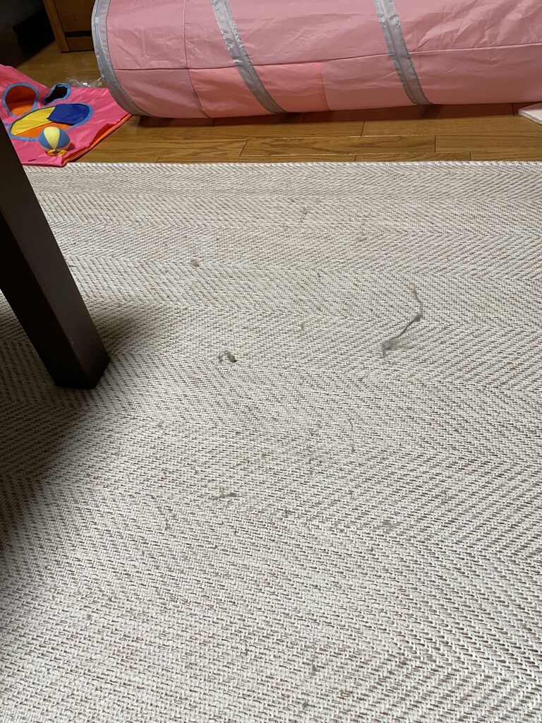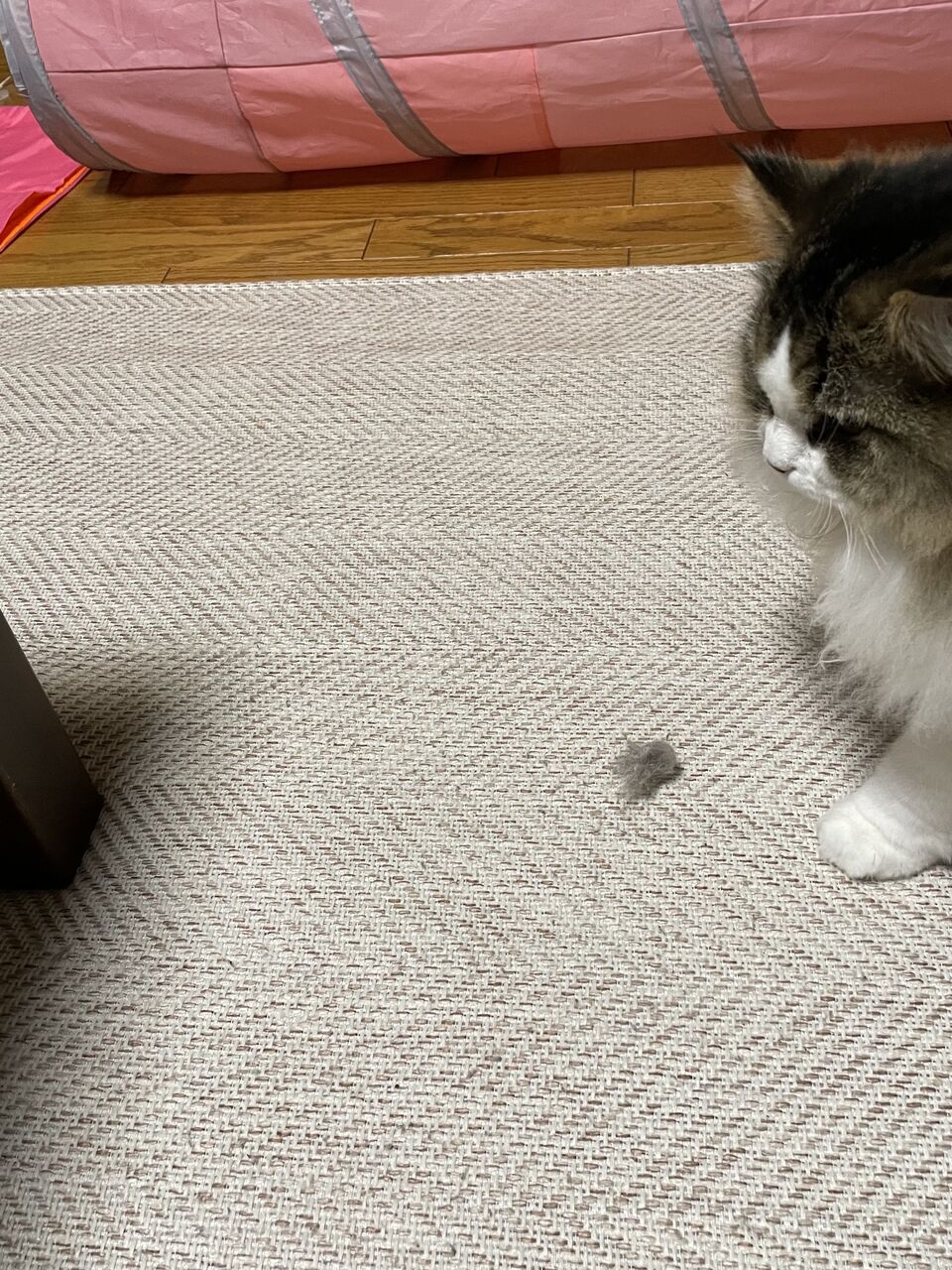 よしよしと思っていたけれど…あららら、毛の塊があちらこちらそこかしこ、ラグの上全部に付いている!!