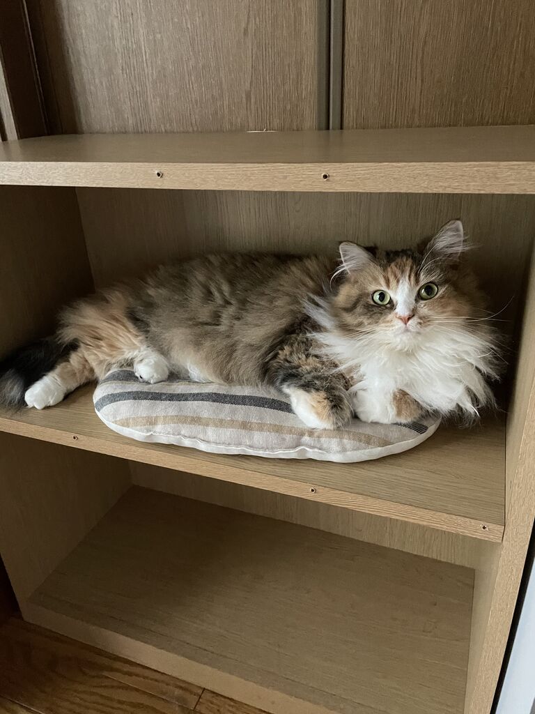 ガイドブックを断捨離した棚でくつろぐなぎ