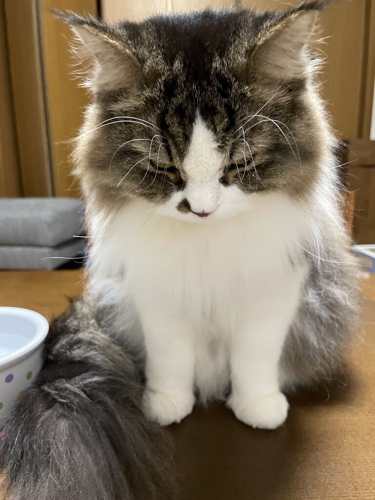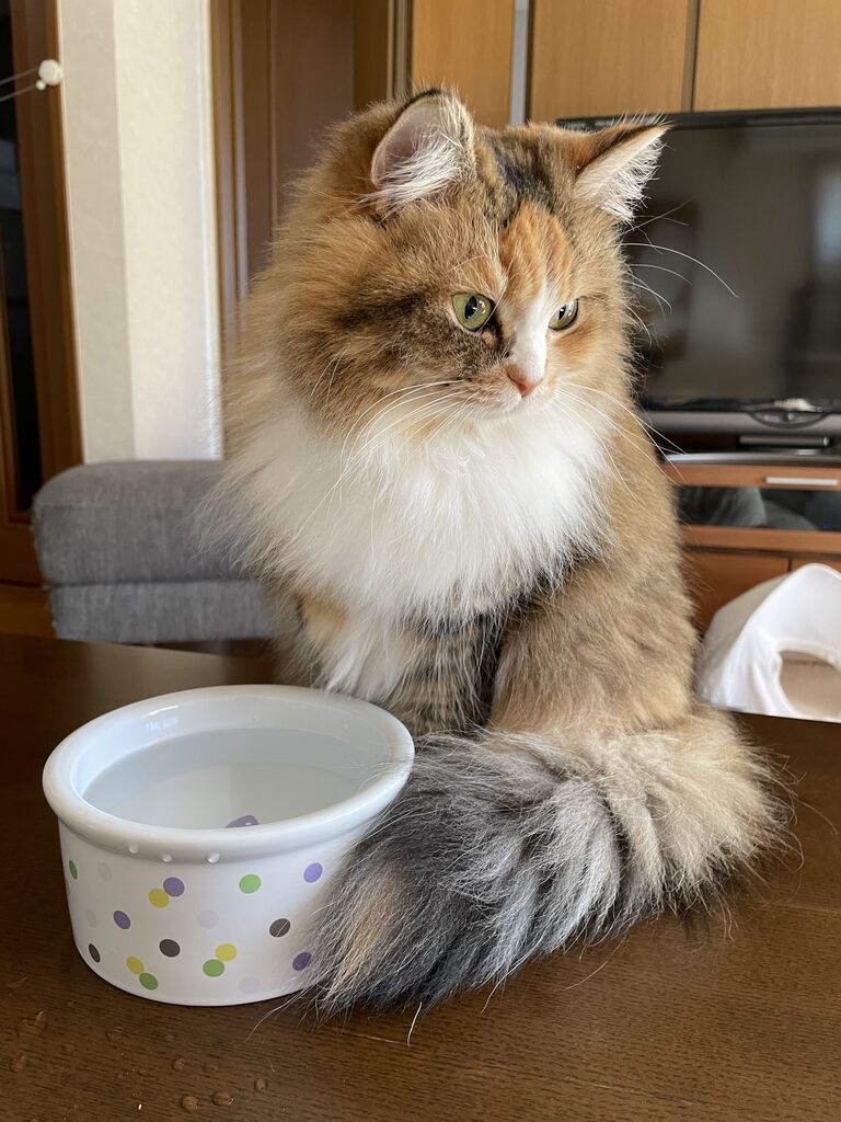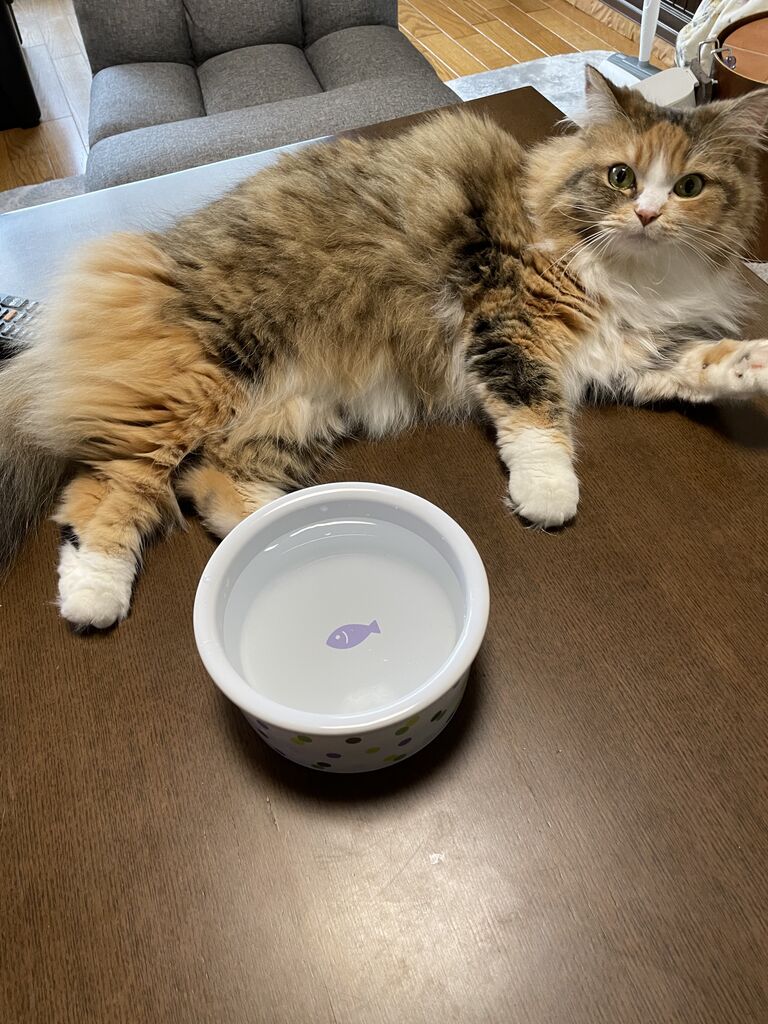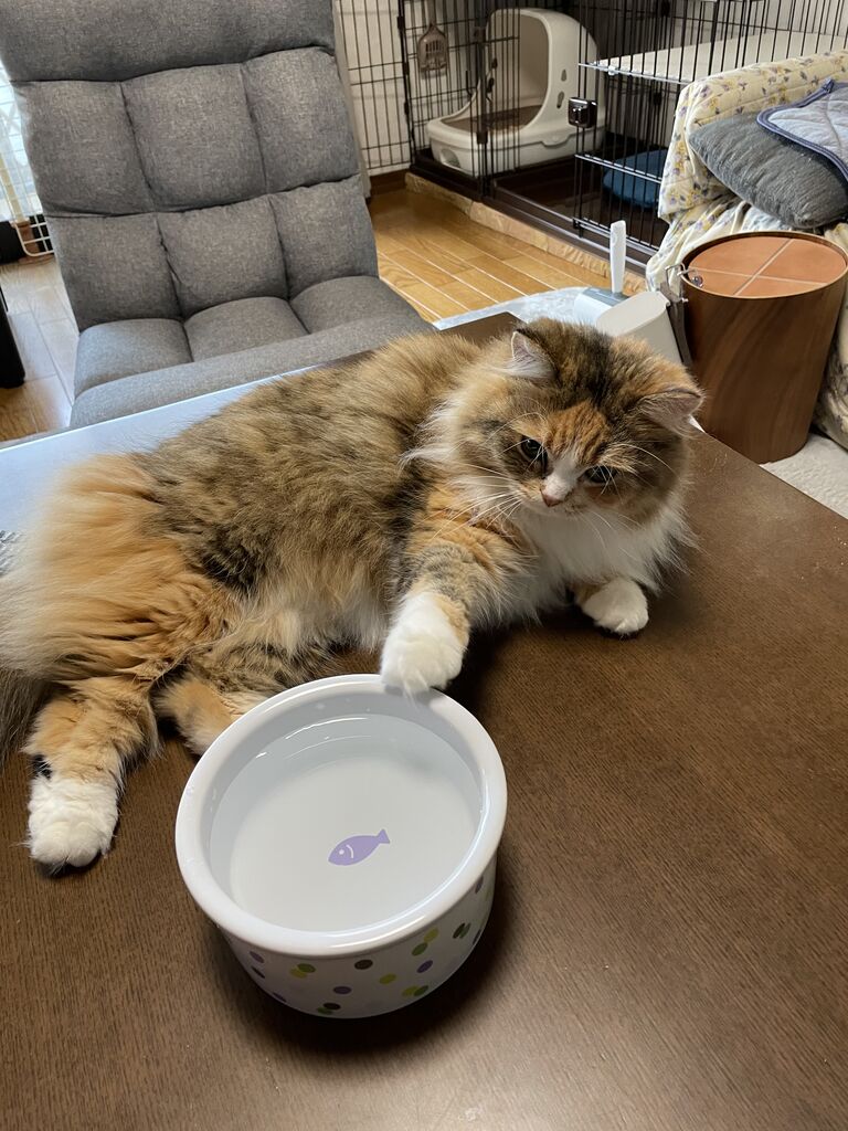 でも要注意!7ヶ月の子猫時代にその水皿をひっくり返した実績のあるなぎは、とにかく「物を落とす」「ひっくり返す」が大好きだから。