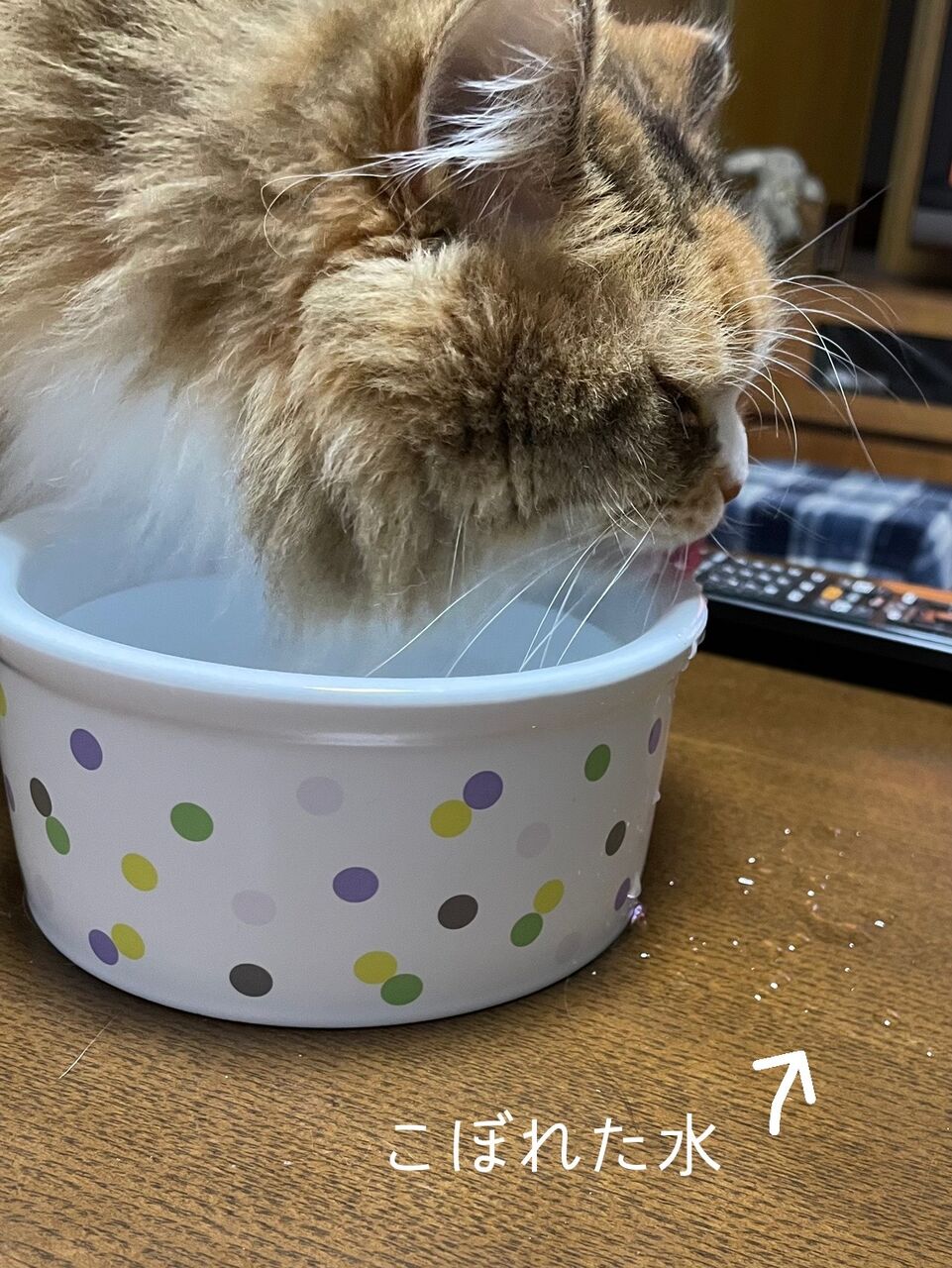 テーブルの上は一面水浸し。こたつ布団も濡れている。