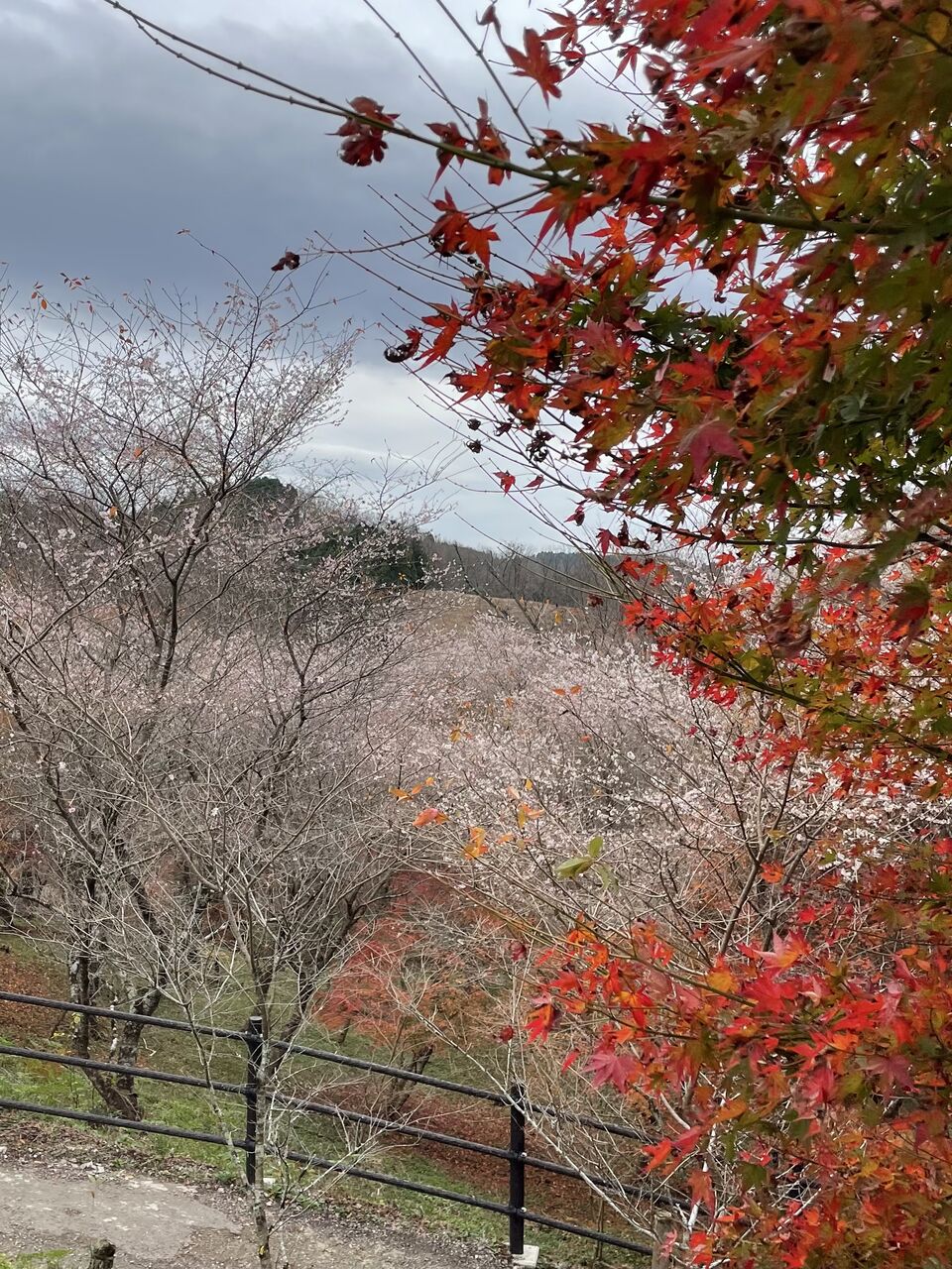 四季桜の花は小ぶりでソメイヨシノよりちょっと地味かな。そのおとなしい感じが紅葉と合っていて、お互いを邪魔しないね。