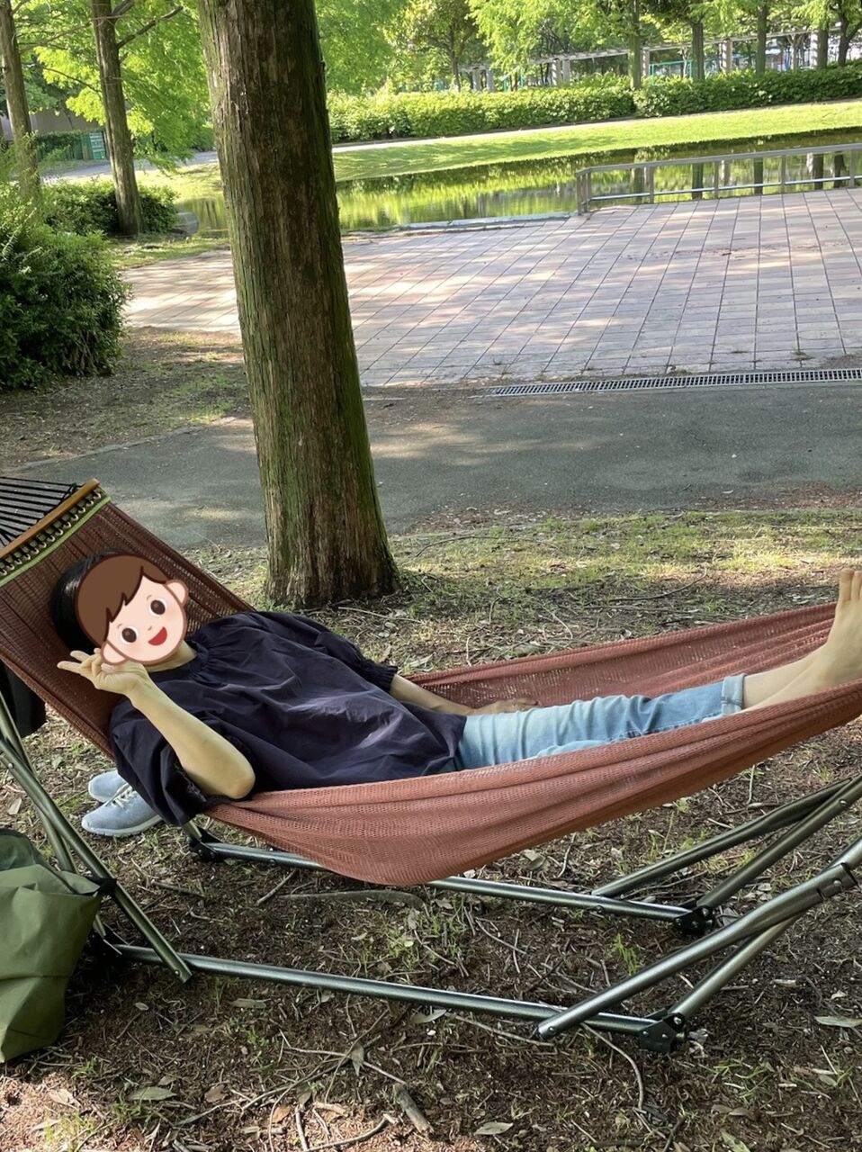 設置は簡単。パッパッと枠を広げてネット部分をかけるだけ。ハンモックを持っていると言ったら「お金持ち!」と言われたことがあるけれど(笑)1万円しないで買えるのですよ。