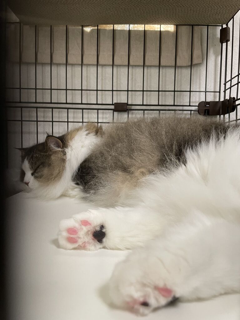 同じ時にカットしたのに、毛の多いテンちゃんの肉球はなぎの3倍くらいの毛で覆われている。