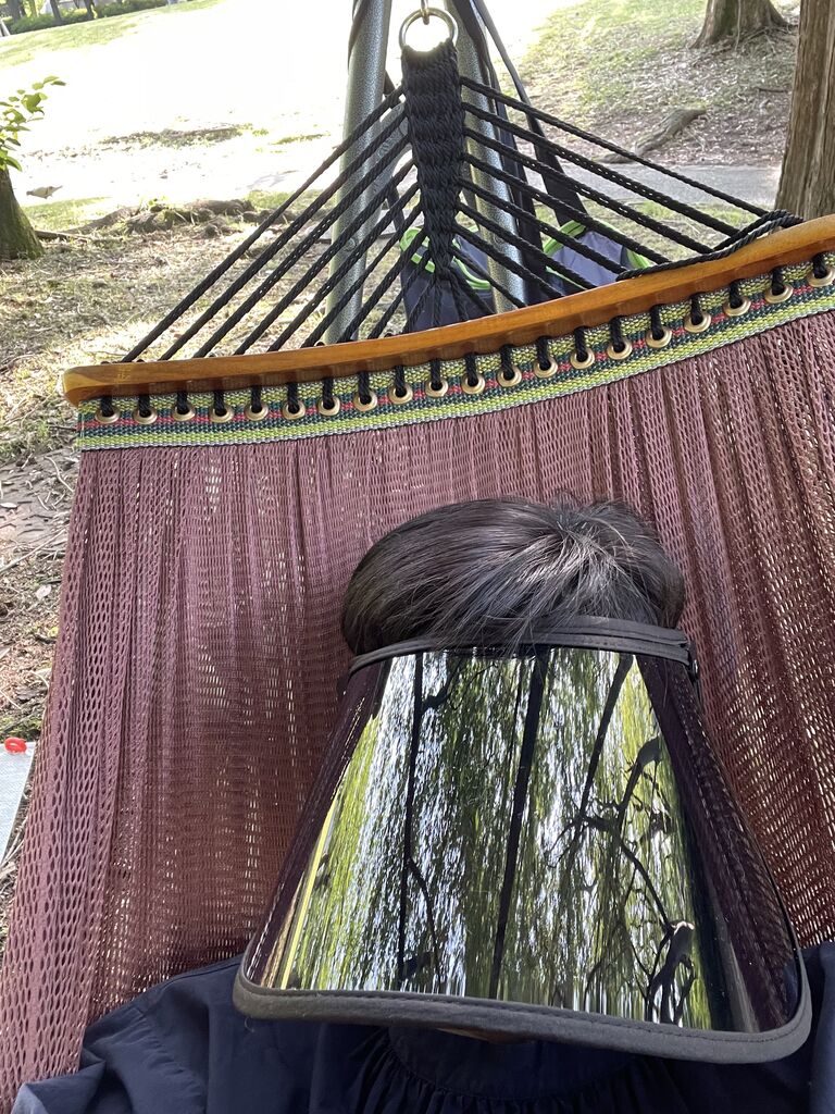 ハンモックは浮いているからとっても涼しいの。顔に陽が当たらないところに設置して、お日さまが動いたらハンモックを動かせばいい。私は大きめサンバイザーも用意しました。