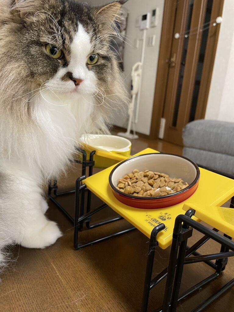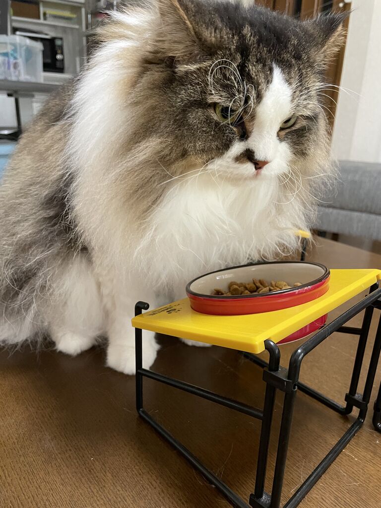 お皿の前で食べずに座っているテンちゃん。