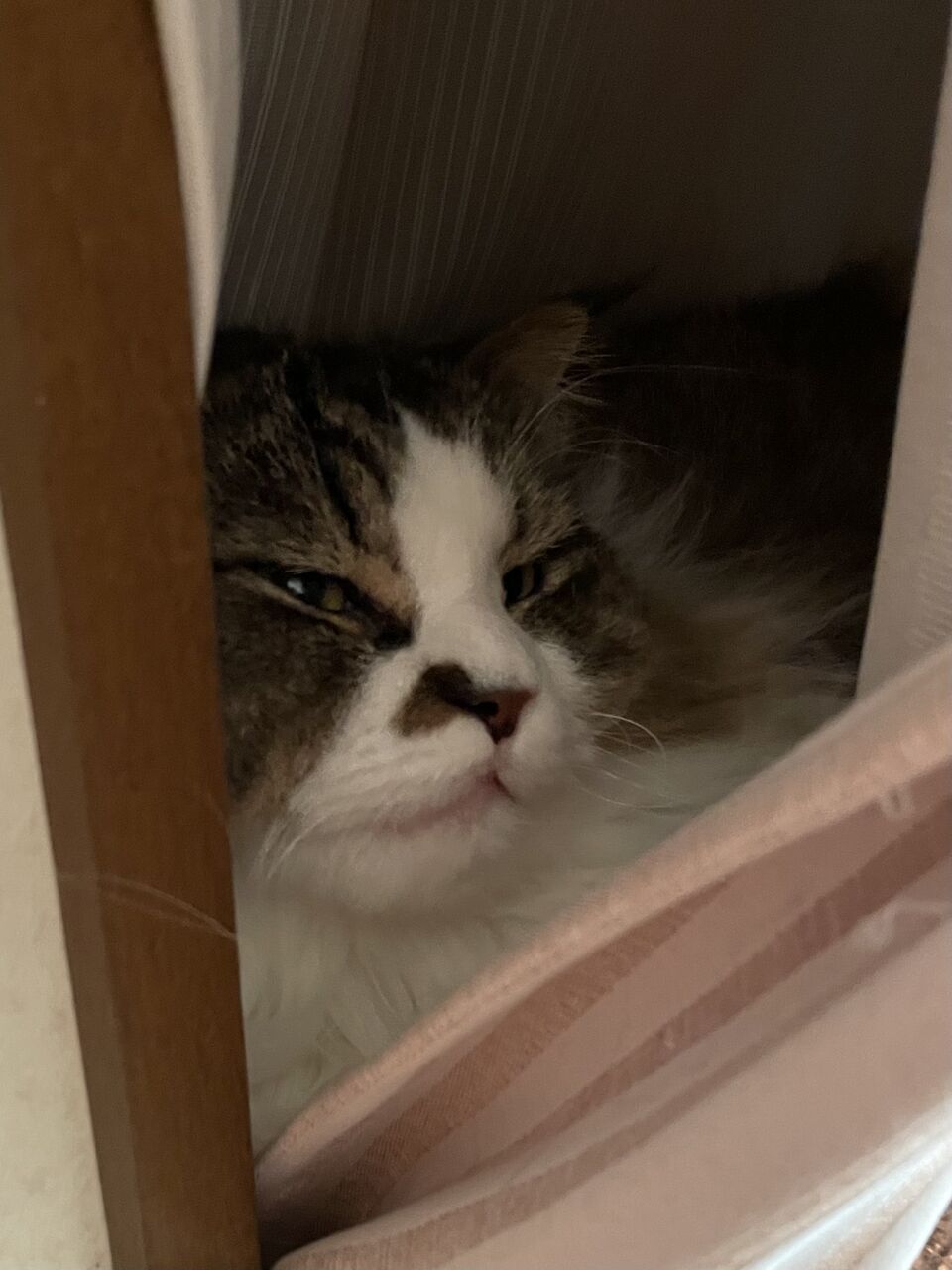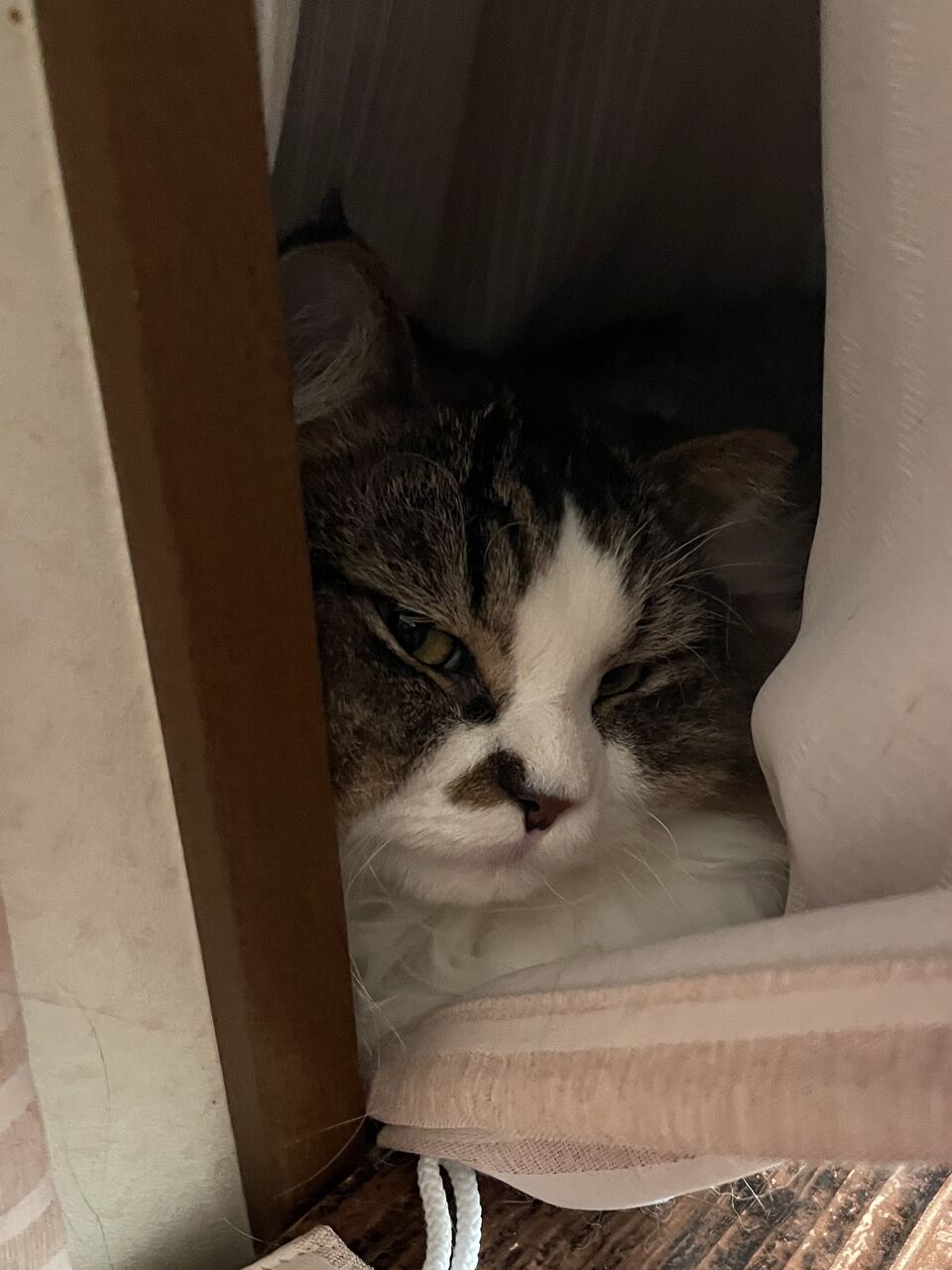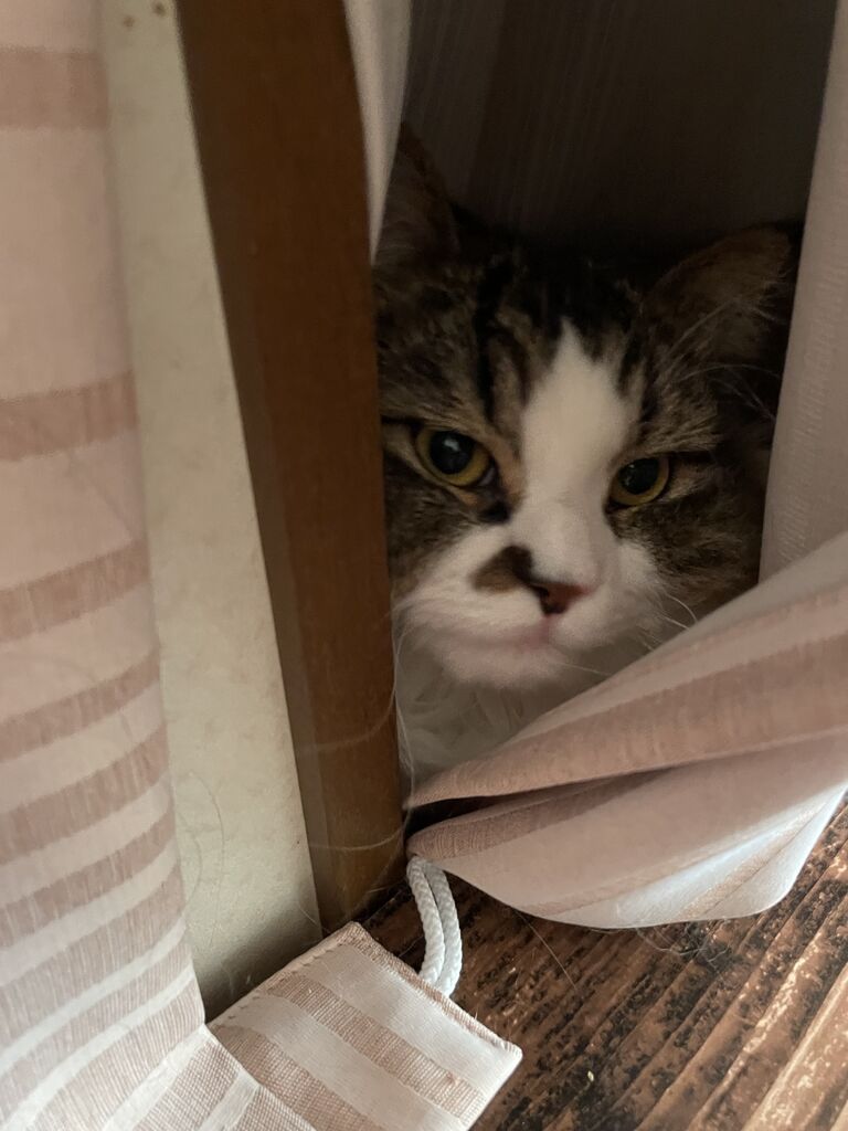 テンちゃんは最近、私の部屋の小窓のカーテンの中でお昼寝をすることが多い。