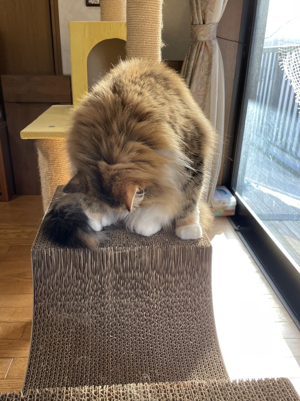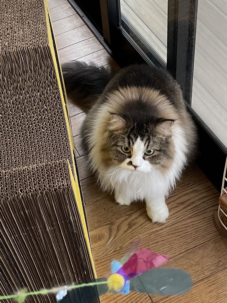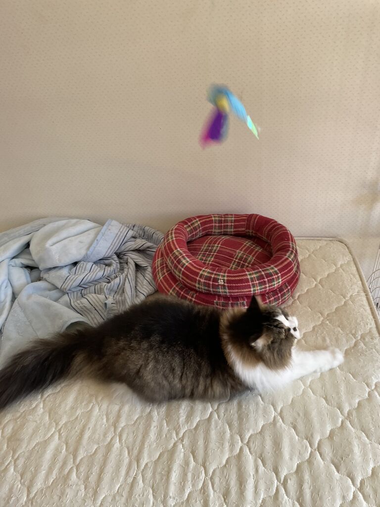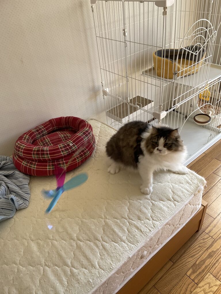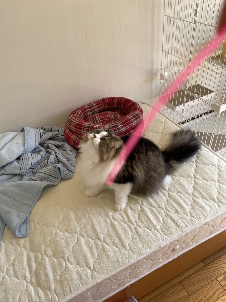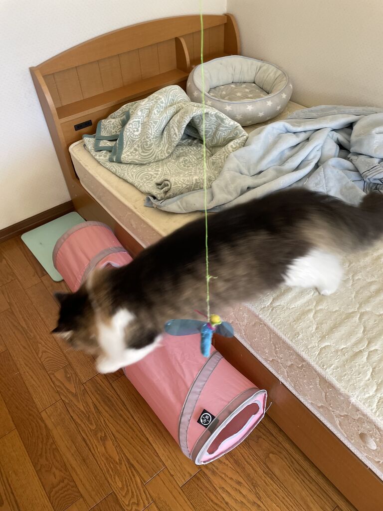 飼い主は新体操のリボンの選手になった気分で、テンちゃんは猫らしく獲物に飛びついて、少しでも運動不足解消しましょう。