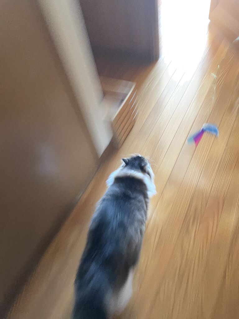 猫じゃらしを文字通りブンブン音がするくらい回すと、テンちゃんも一緒にクルクル回る。ジャンプして飛びつく。
