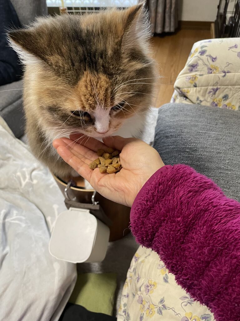 手からカリカリを食べるとき、なぎはちょっとだけ指の匂いを嗅ぐ。
