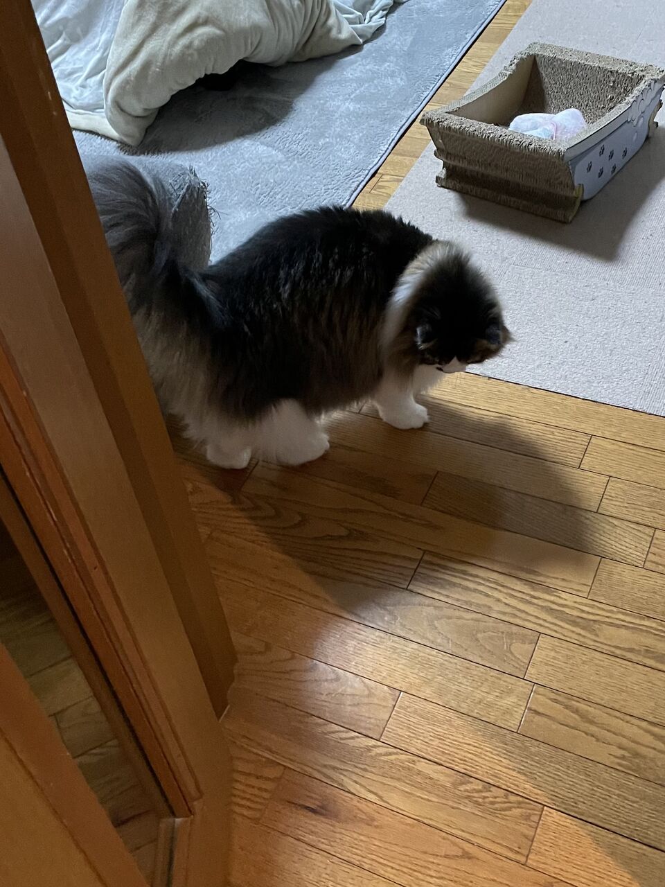 廊下や食卓の電気をつけると、自分の影を追いかけてクルクル回る。そして私の影に飛びついてくる。