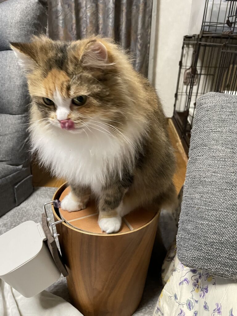 でも昼間私たちがいるときには基本手から。私から食べさせてもらうときは、ゴミ箱の上にちょこんと乗って「ミャッ」と鳴く。