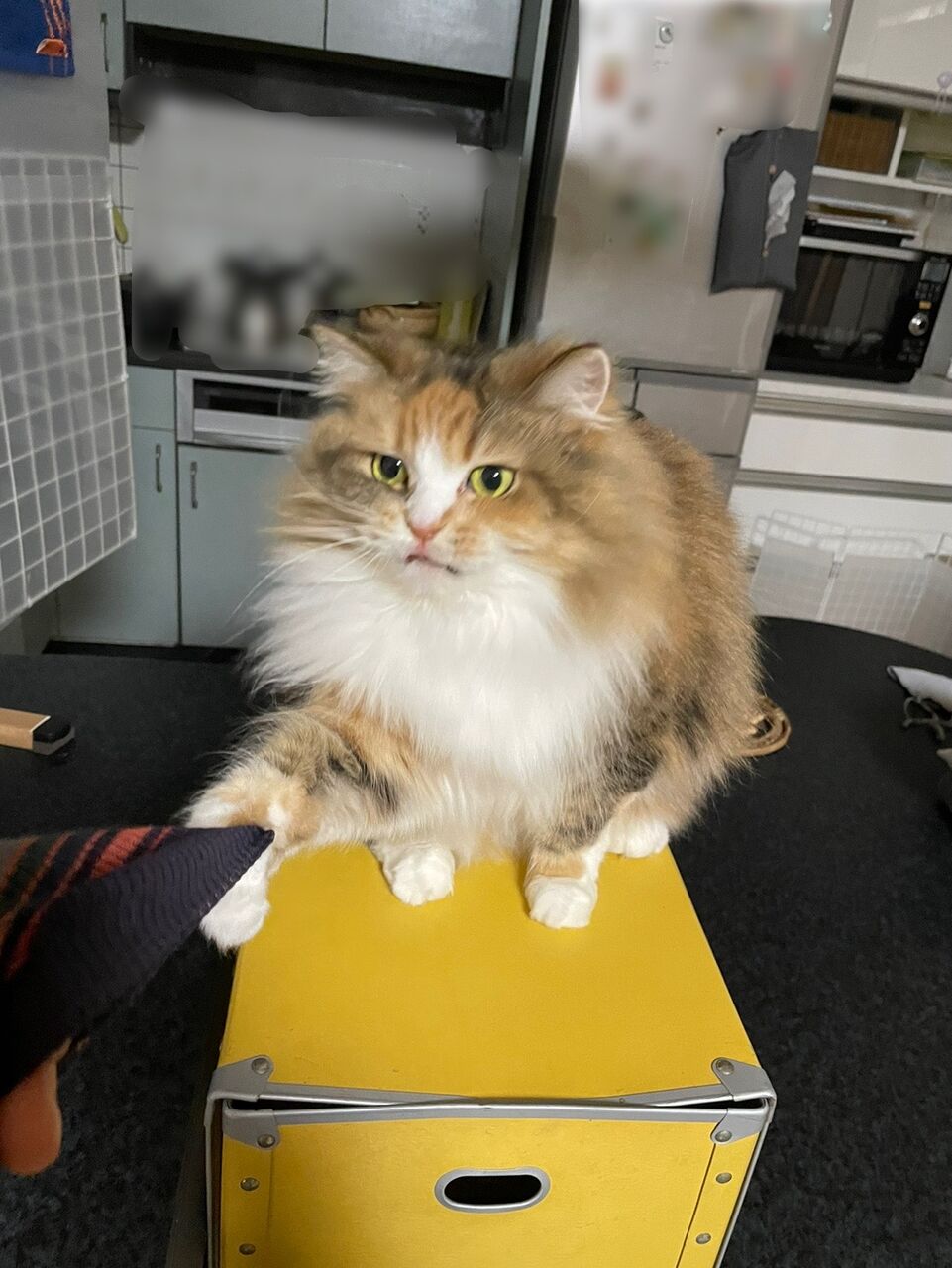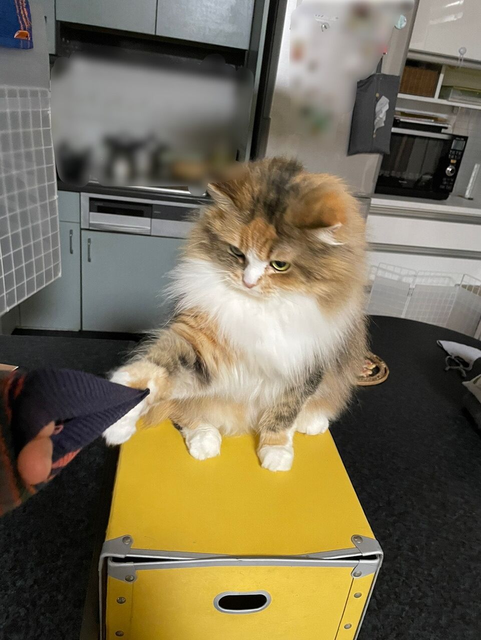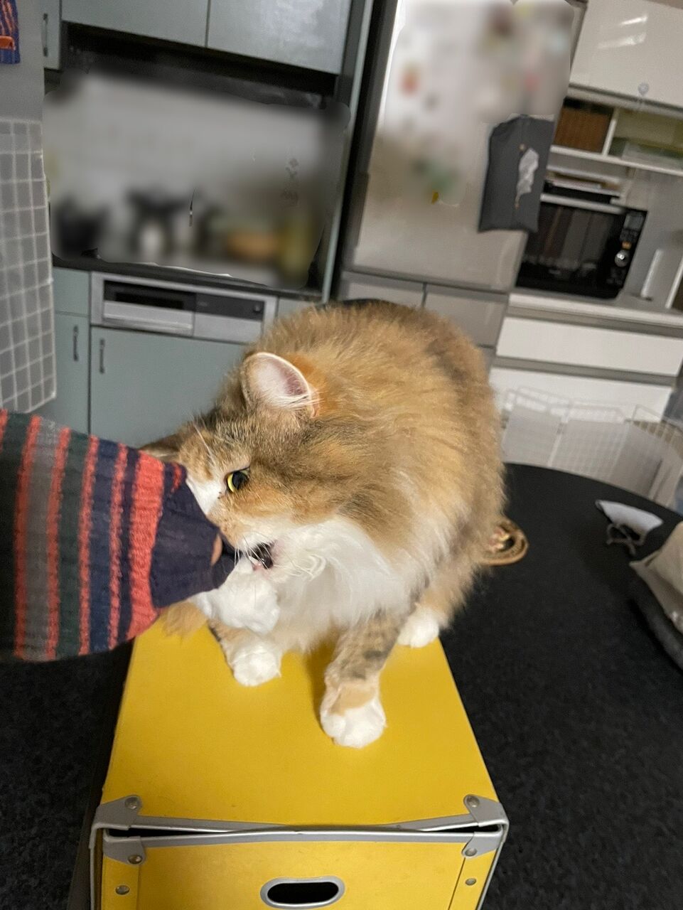 捕まえられた飼い主。セーターの袖が爪に捕らえられて伸びる〜!