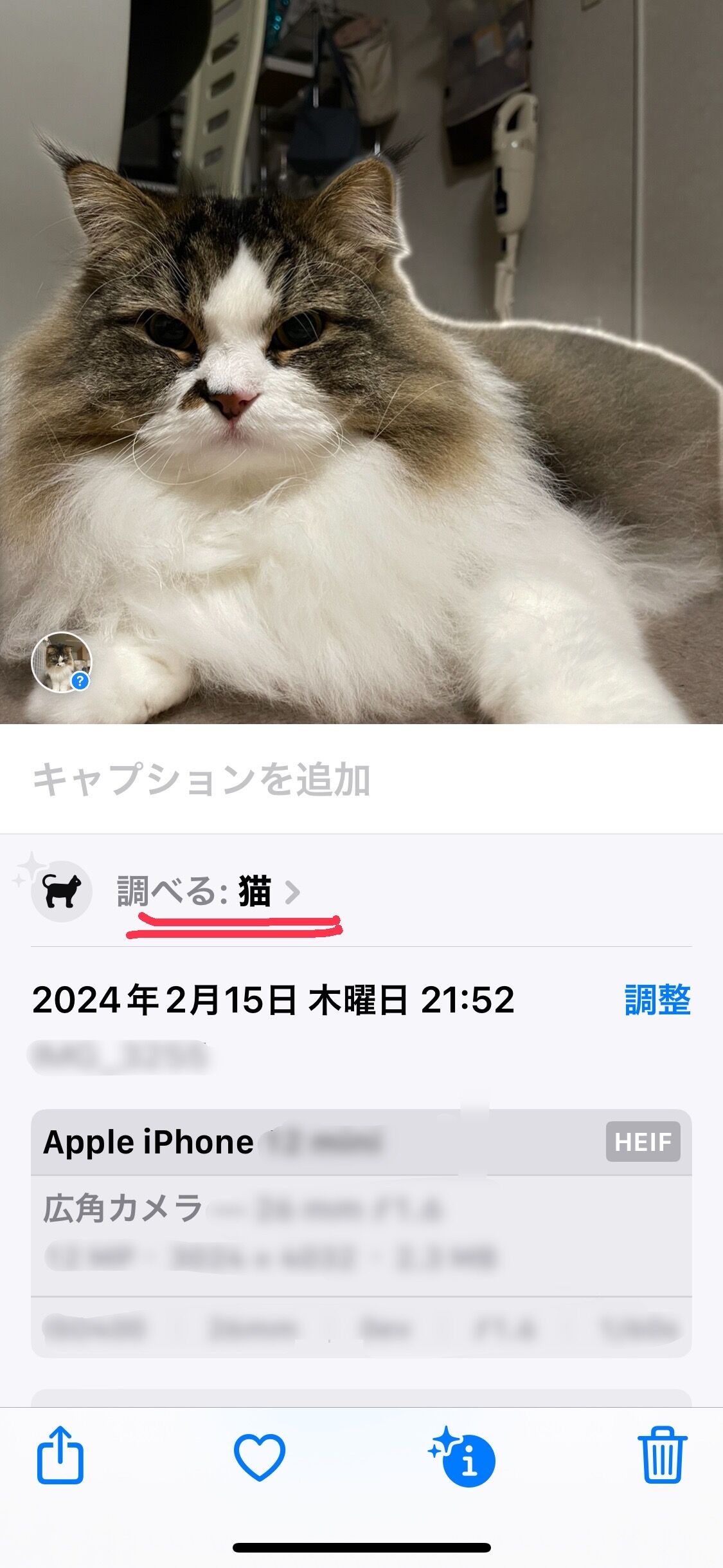 写真アプリの写真の下の部分をピッと上へスクロールのようにすると、いつどういうバージョンで撮影したという詳細が出る。その1番上に〈調べる〉というのがあって…ああ、スマホに詳しくないので実物を見てもらいましょう。