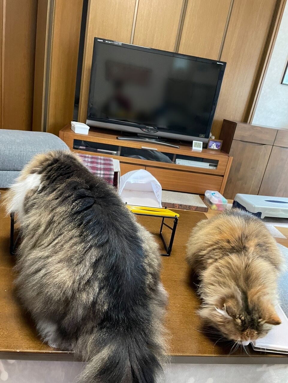 130g完食か?!という朝、お皿からテンちゃんが、私の手からなぎがラストスパートをかけている。