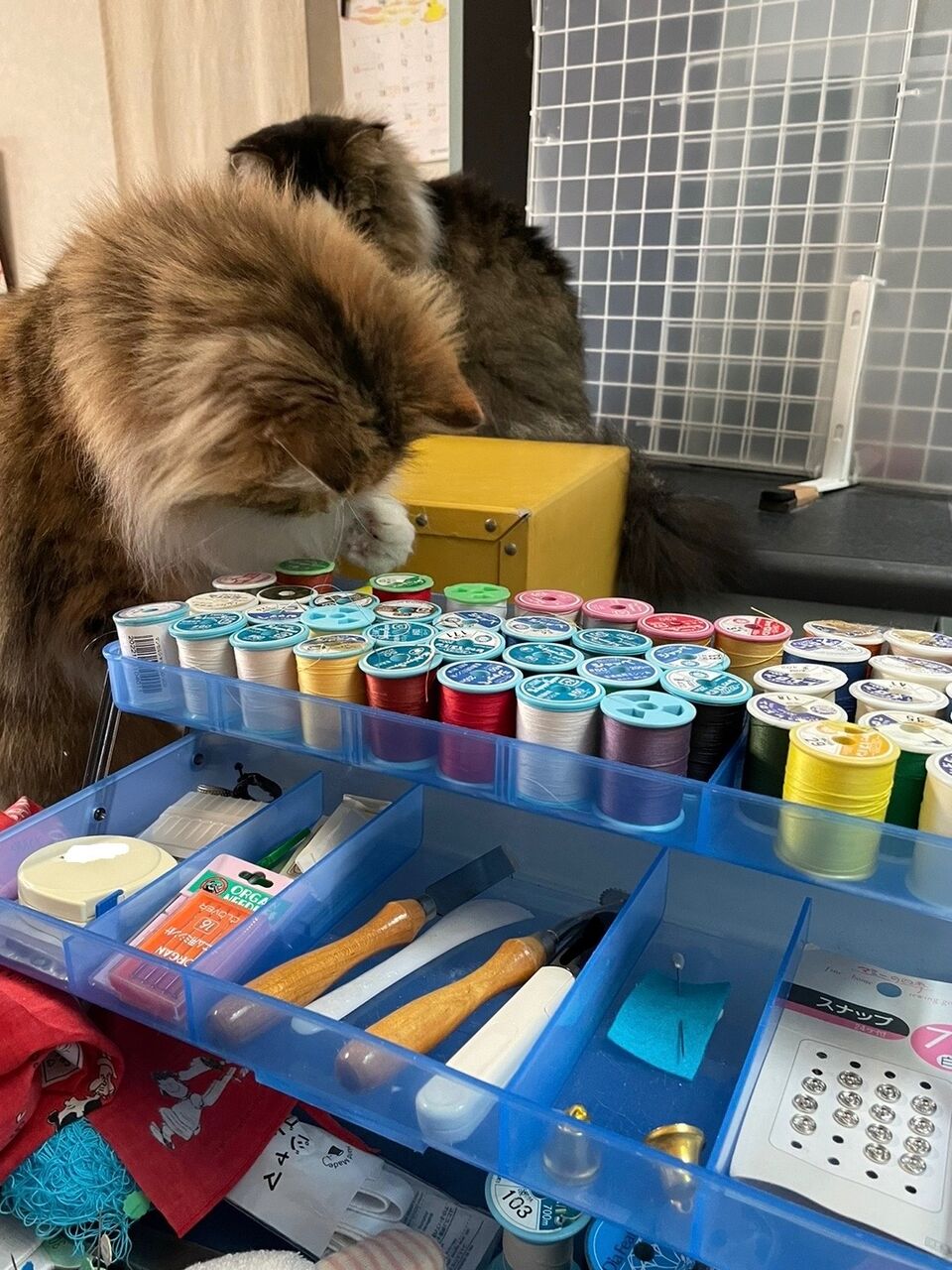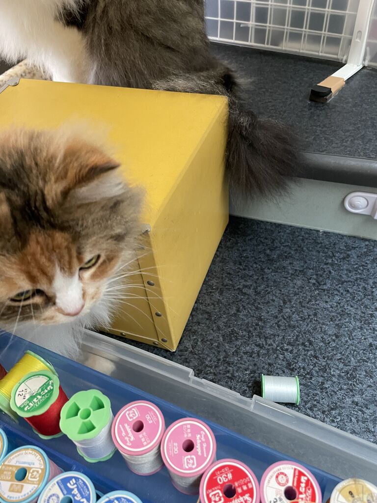 きれい並べてある糸を見つけて器用に取り出して落とす。