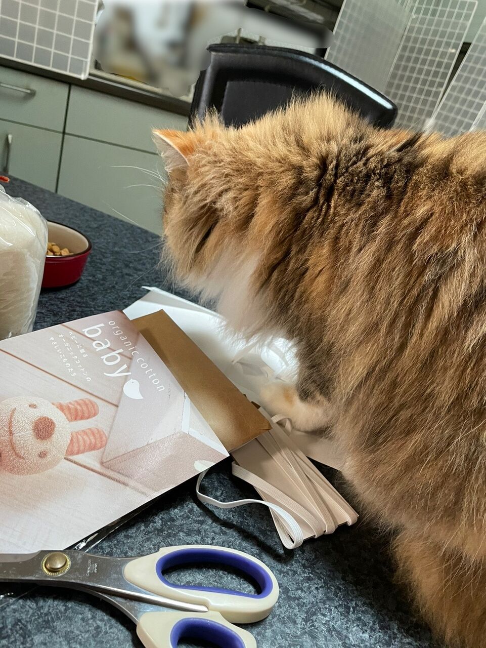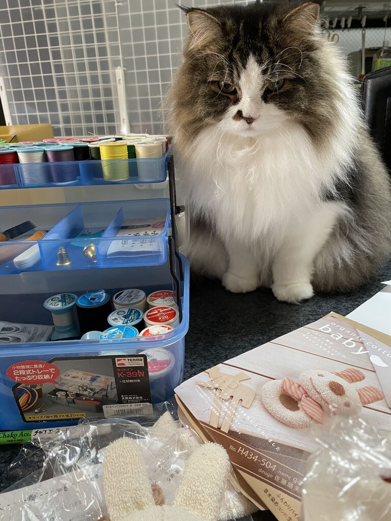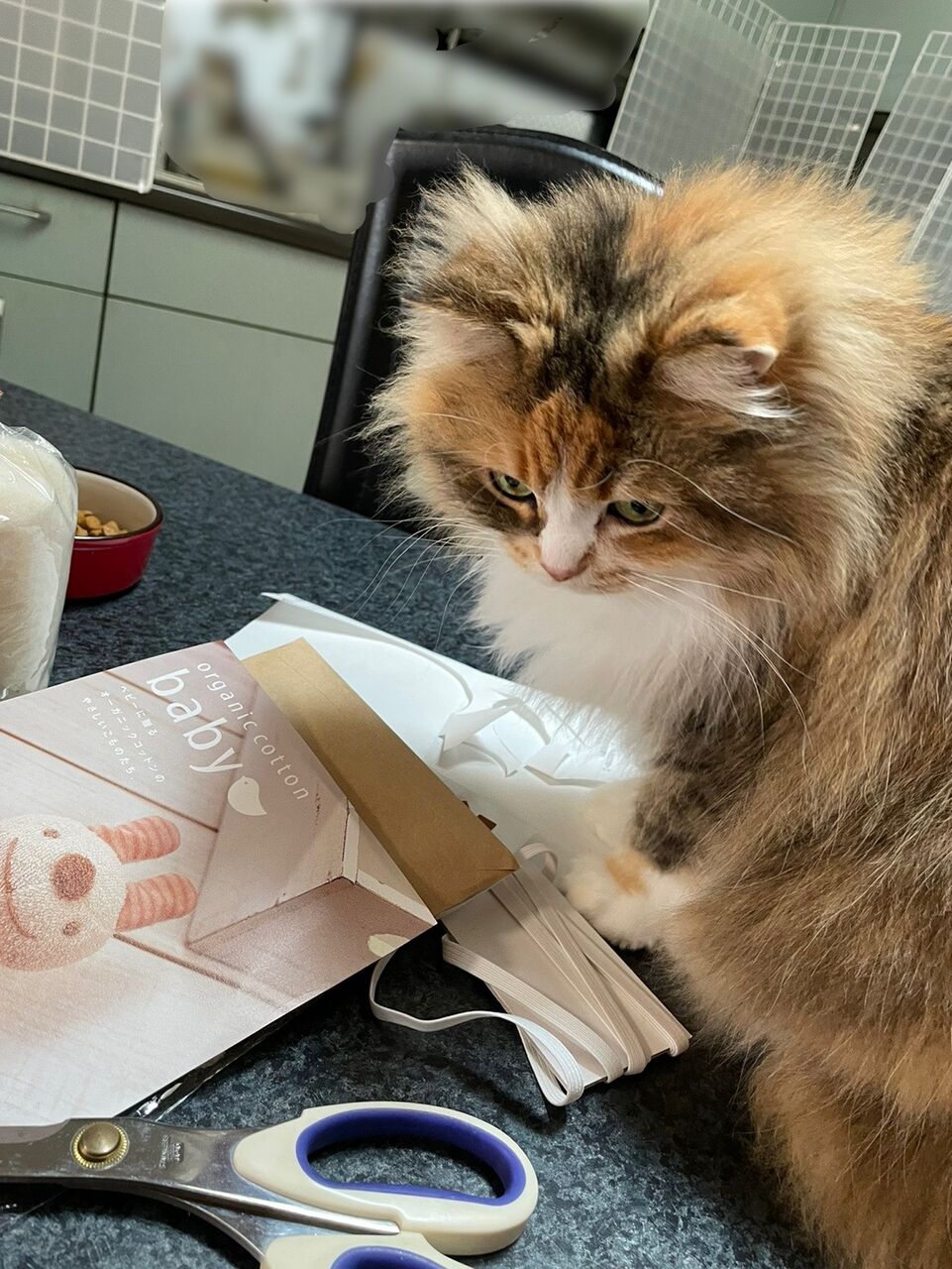 手芸をするためにテーブルの上に裁縫箱やハサミや布などを広げていると、テンちゃんがやってきた。