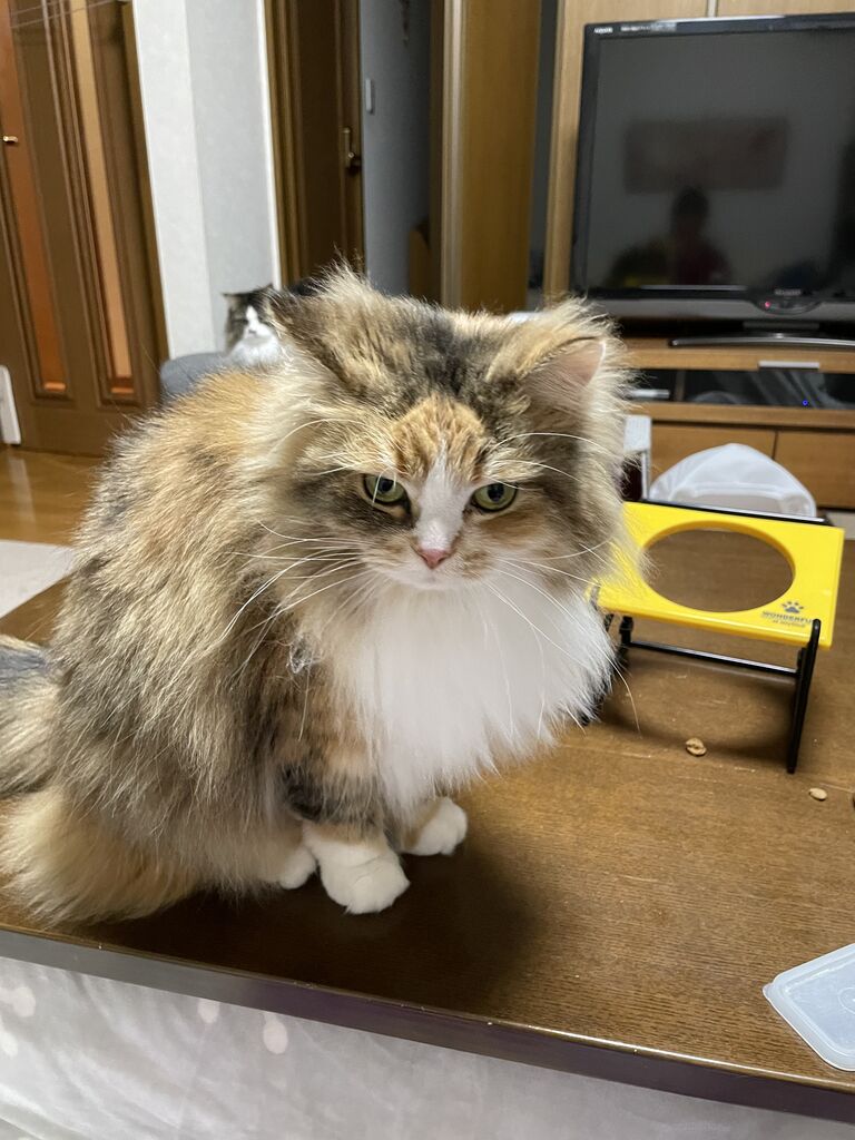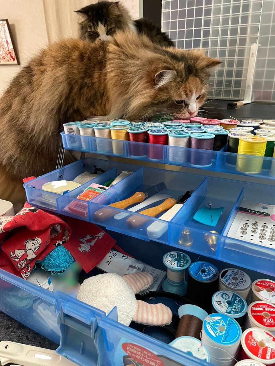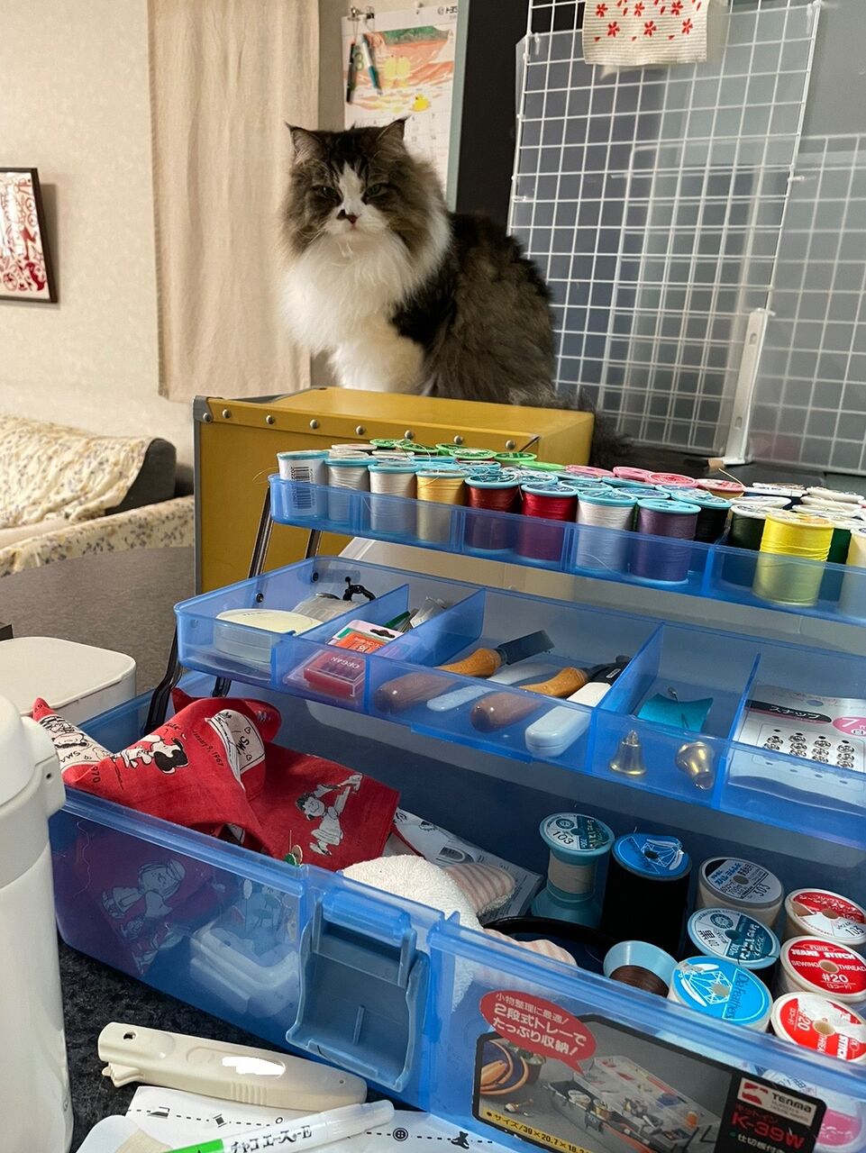 手芸をするためにテーブルの上に裁縫箱やハサミや布などを広げていると、テンちゃんがやってきた。