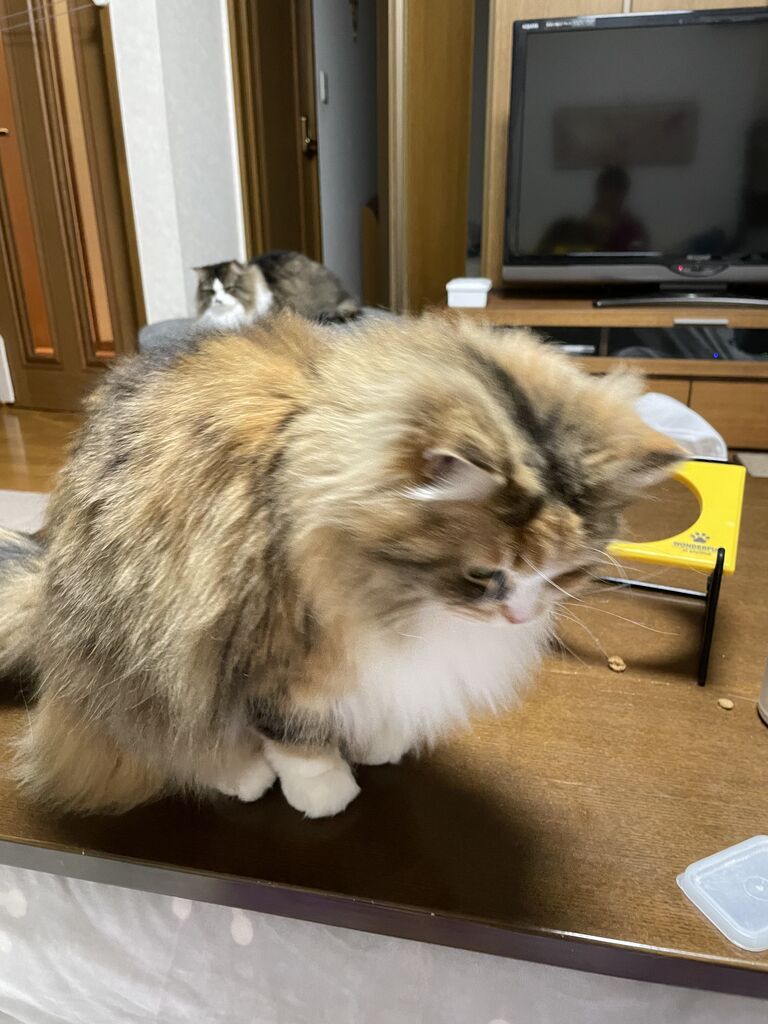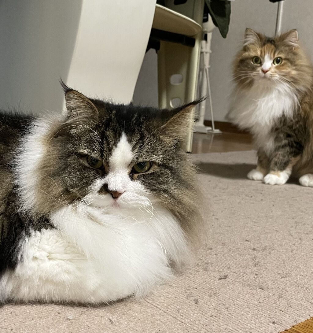 そばで監視をしているテンちゃん、悪さをするこの猫さんを注意してくれないの?ぽわ〜んとした顔して見てるだけ?(笑)