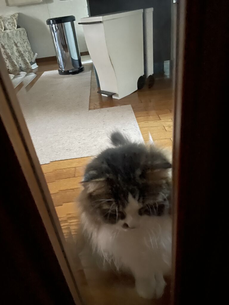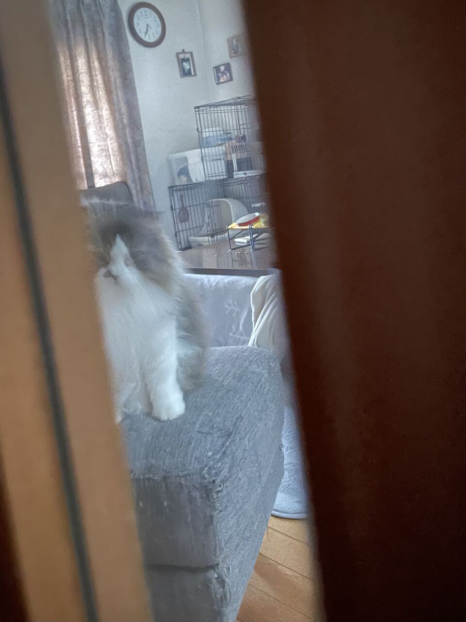 今日ちょっと近づいてみると、オットマンを下りて「出してほしい」とお外(廊下)を見つめる。
