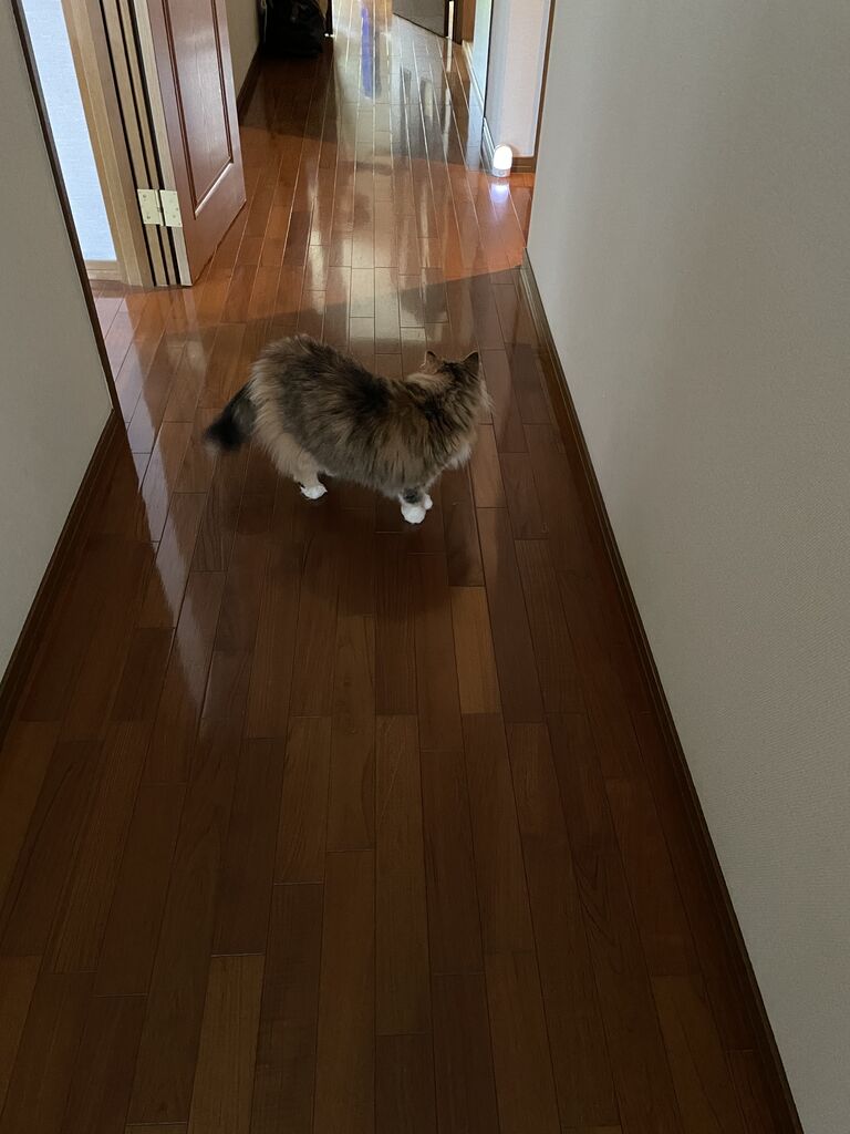 寝る前、居間に入りたくなくて廊下のトンネルに籠城していたなぎ。