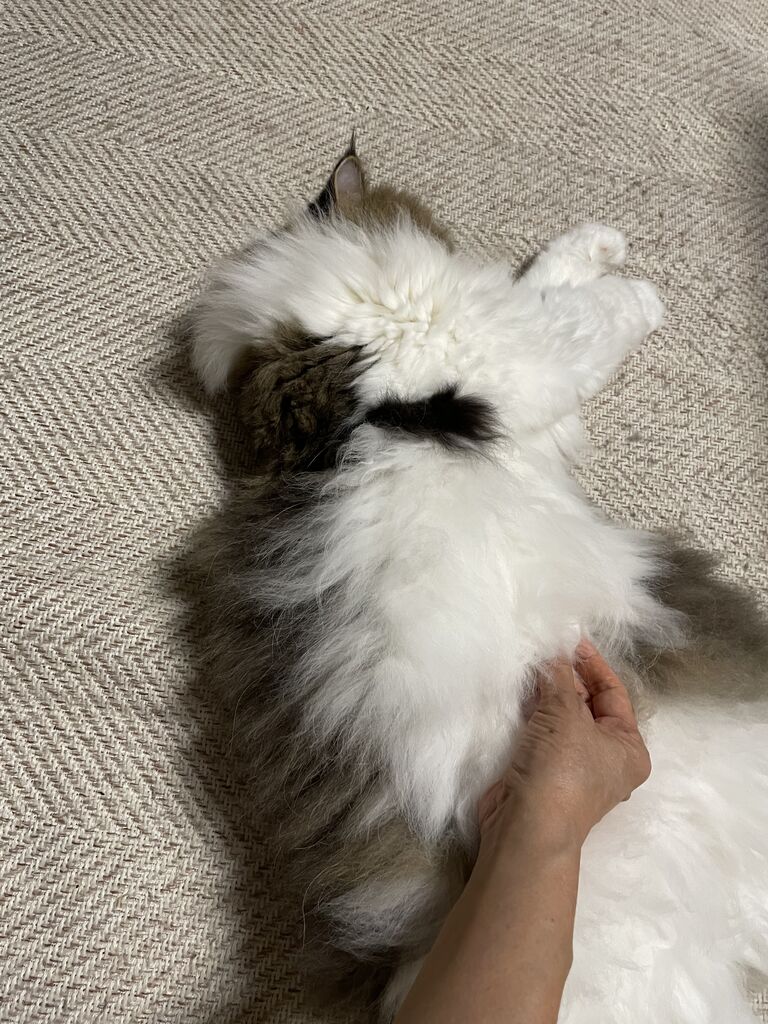 テンちゃんは「飼い主さん、ぼくのおなかなでてるときいつもしあわせって言ってるよね。ほら、しあわせあげるよ、なでてなでてだニャー!」と誘惑のポーズを見せる。