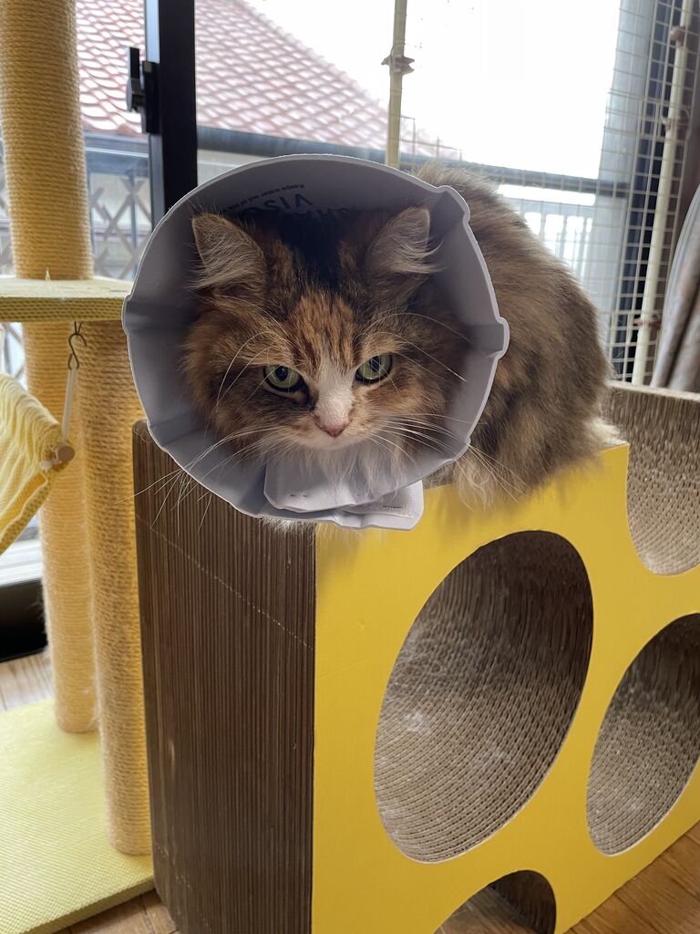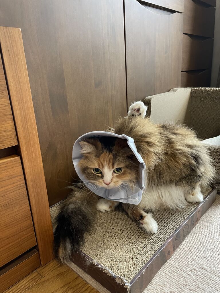 なぎはドライヤーが怖くないので、エリザベスカラーをつけて一気に乾かす。