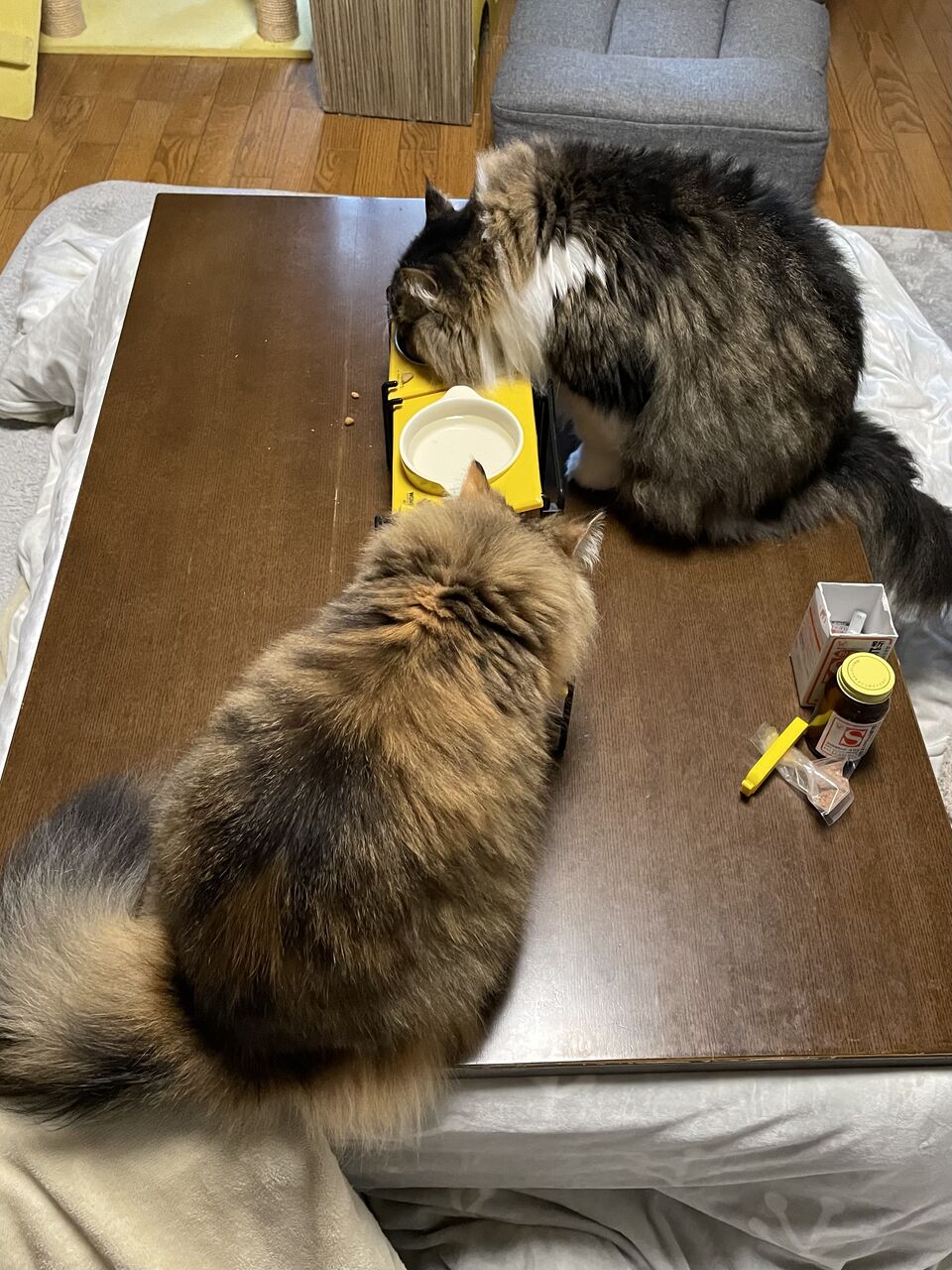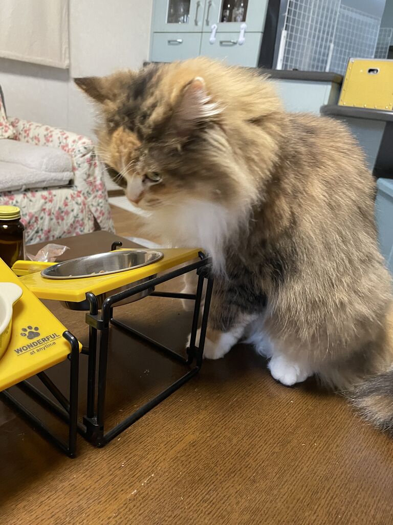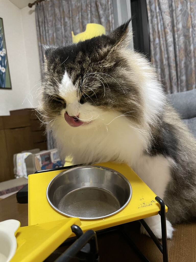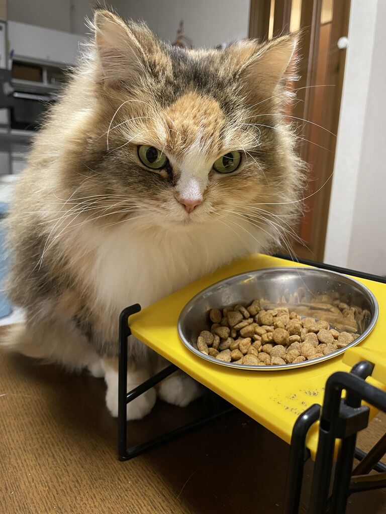 置きエサの我が家、ふたつのエサ皿は片一方だけがカラというときがある。
