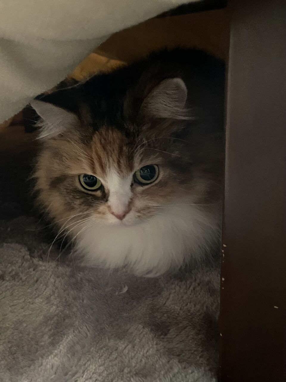 テンちゃんは赤いベッドの中でウトウト…私がのぞくと目を開ける。そしてすぐにベッドから出て、このお顔。