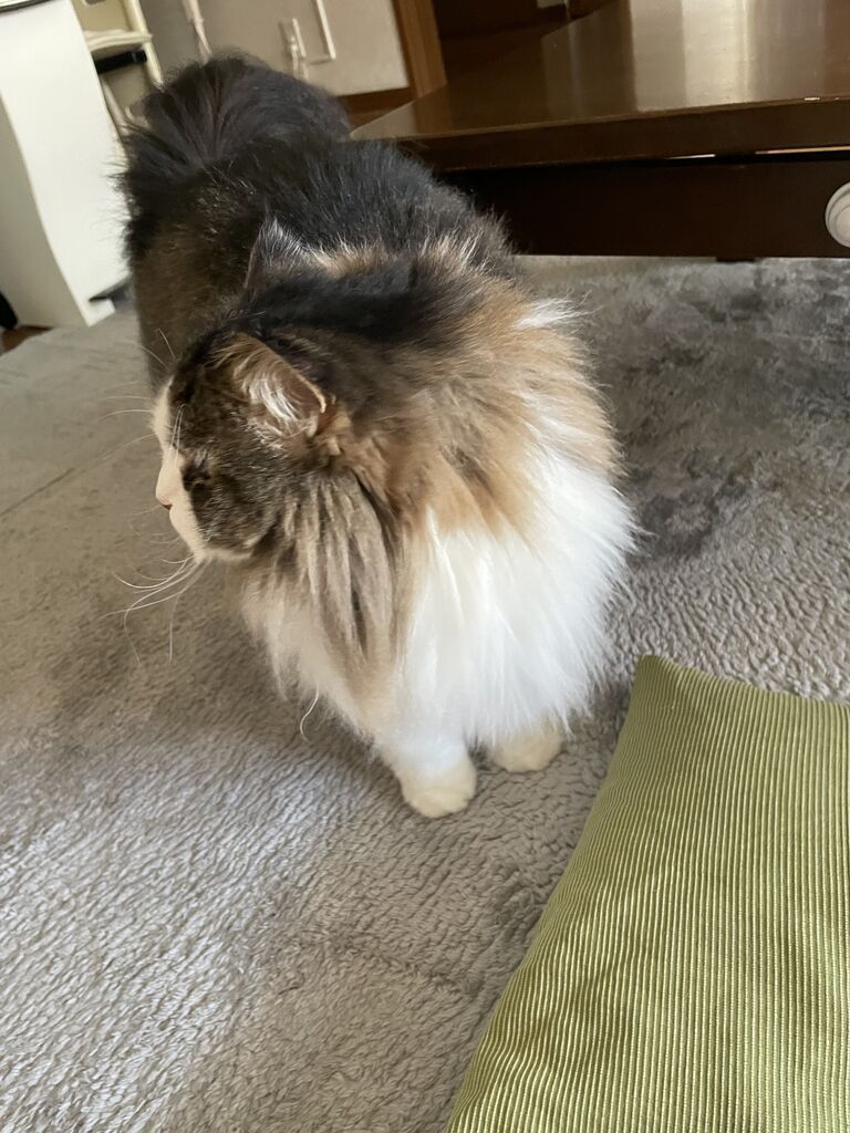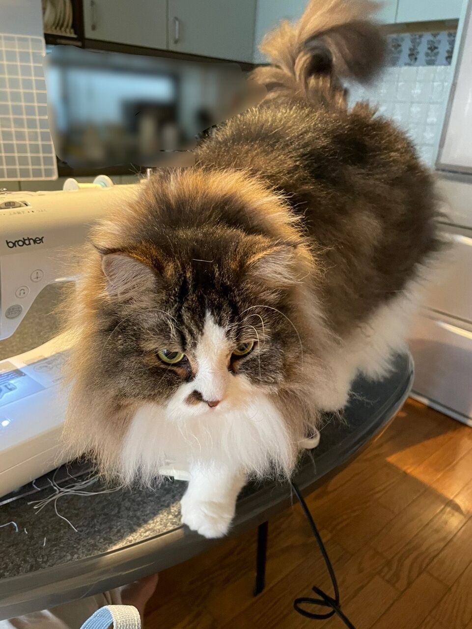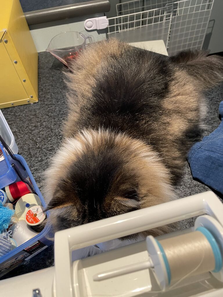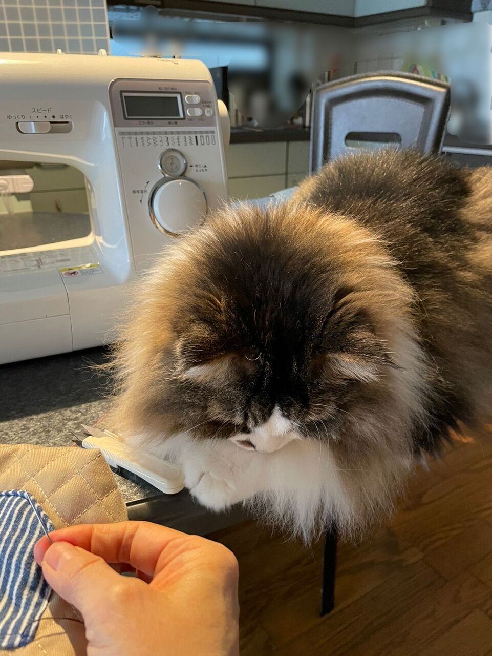 テンちゃんはじゃまはせず、お利口にずっとミシンのそばに座っている。