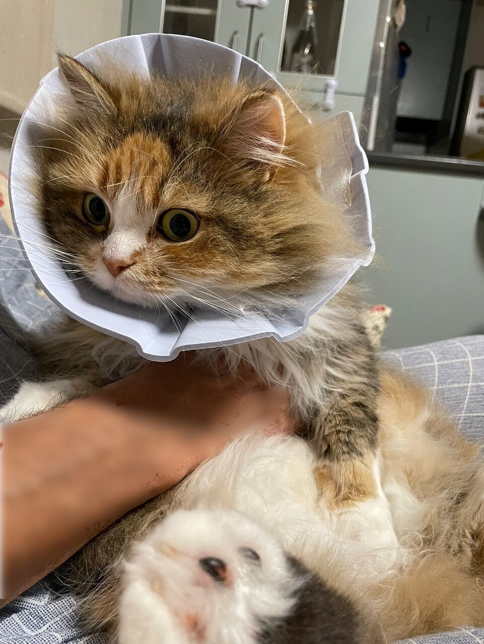 なぎはエリザベスカラーをつけて赤ちゃんみたいになって、ダンナに抱っこされる。