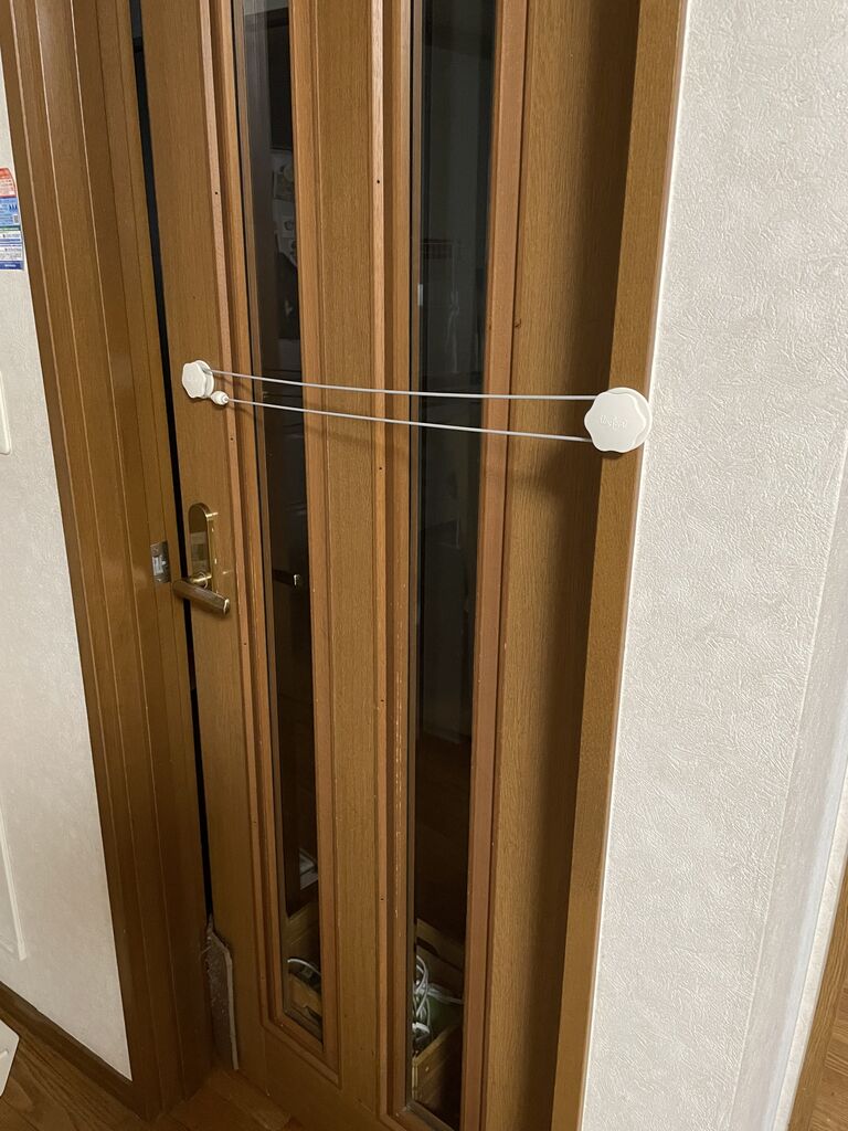 居間のドアはゴムの力で自然に閉まる半自動ペットドアなので、寝るときは外に重しを置いて開かないようにしている。