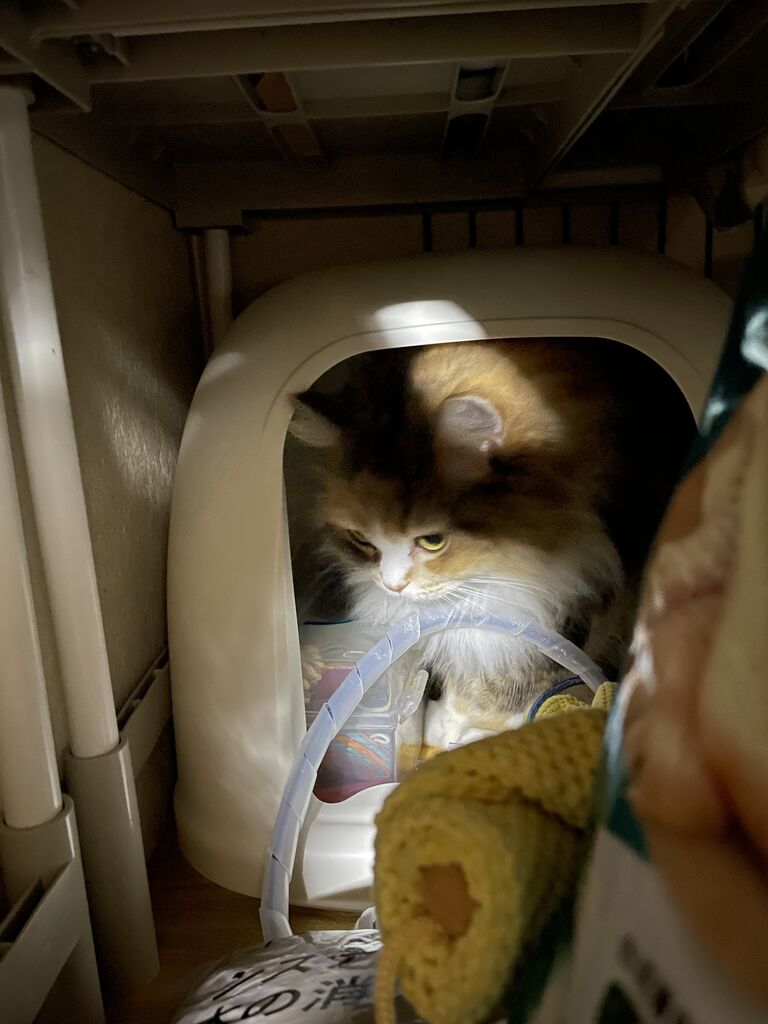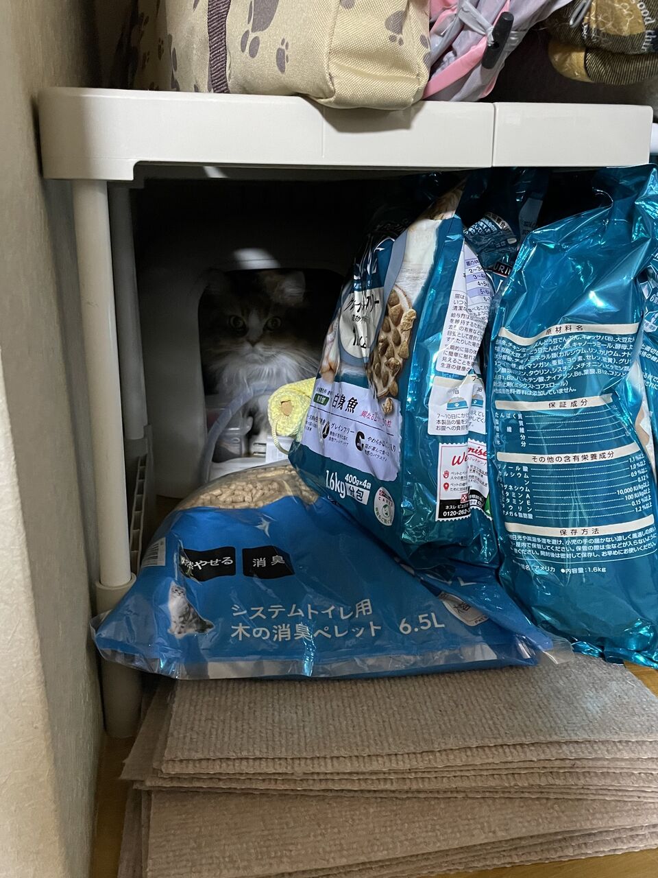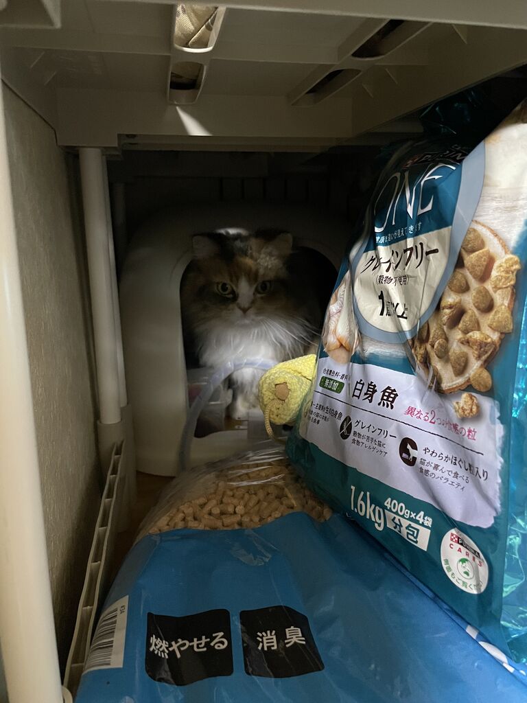 猫グッズが置いてある棚の奥の奥、見えないくらい奥になぎはいた。