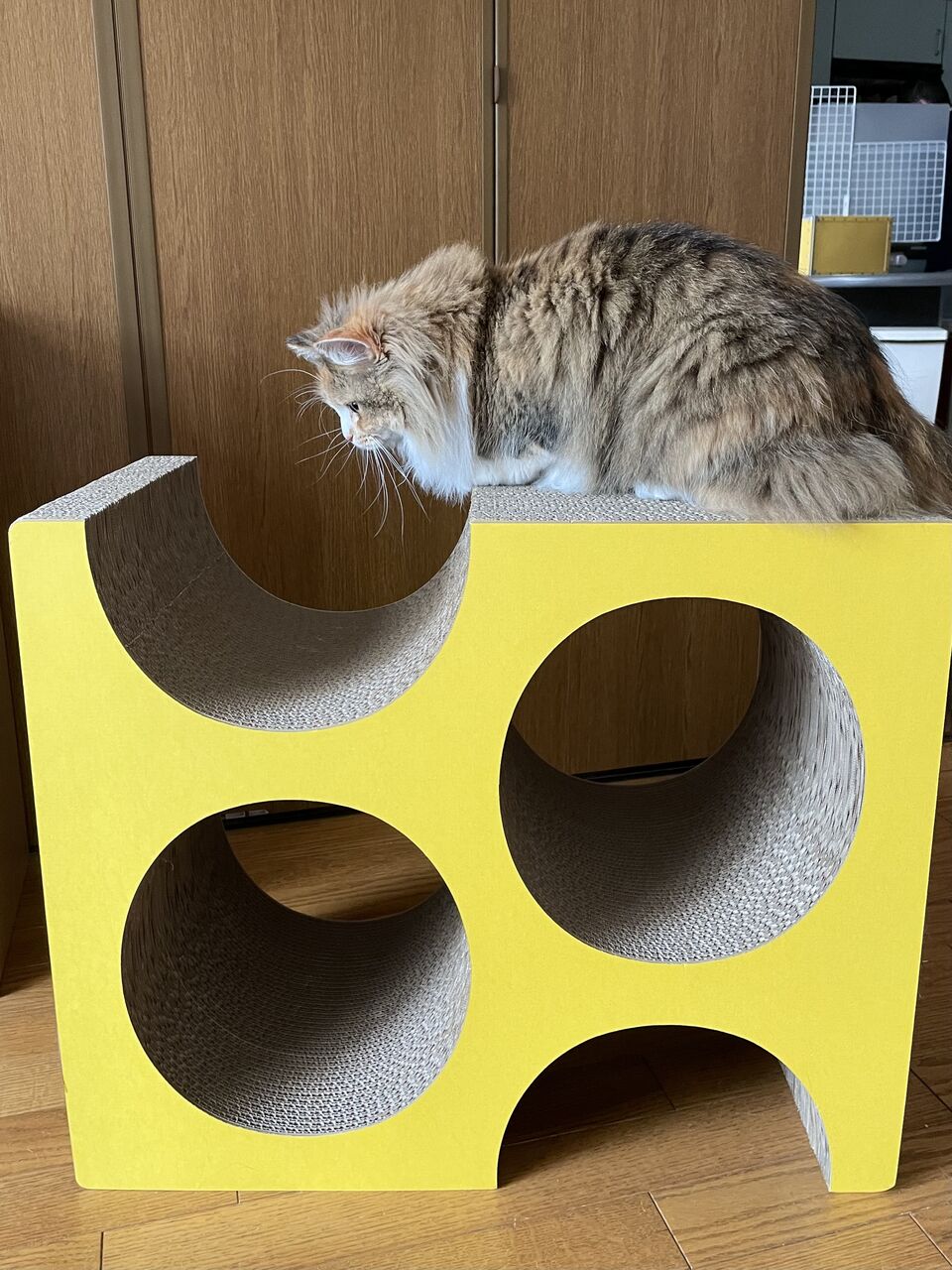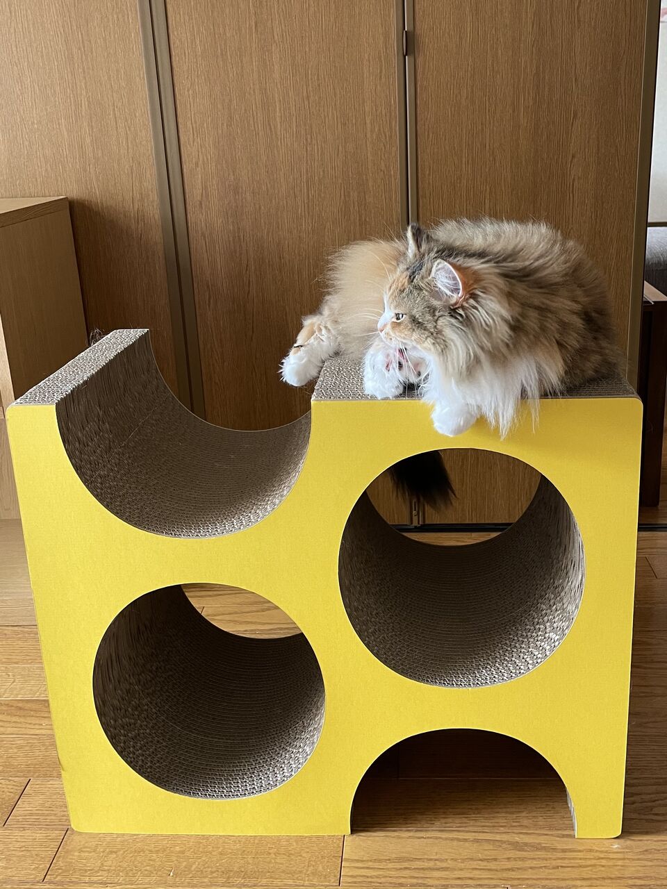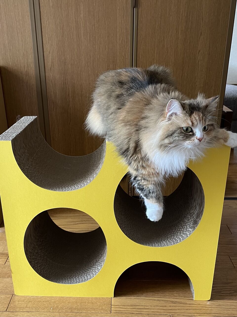去年は食器棚の上を開放するというプレゼントだったけど、今年はふたりで使えるチーズ型の爪とぎをプレゼント。