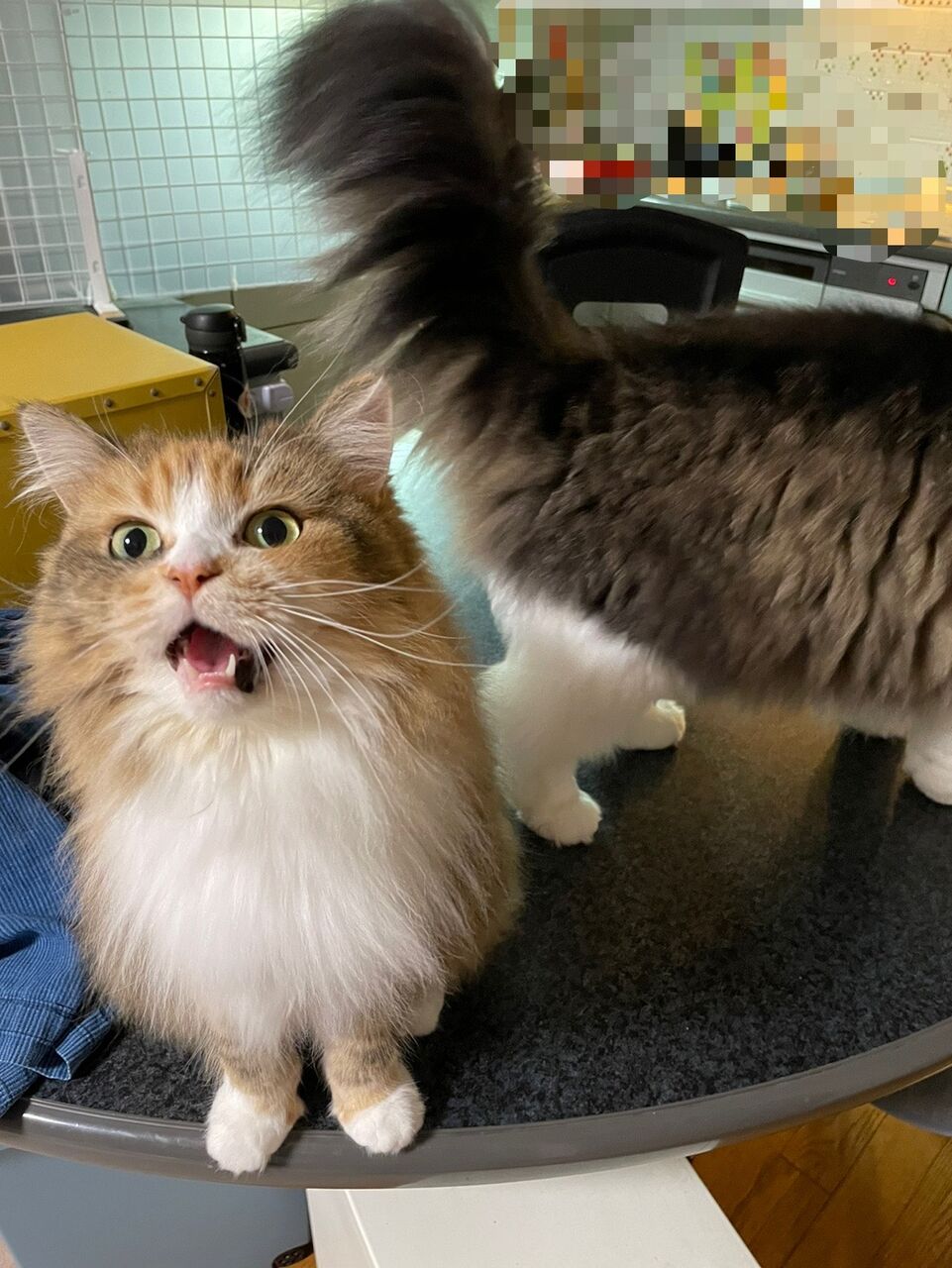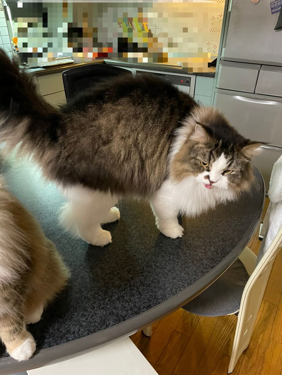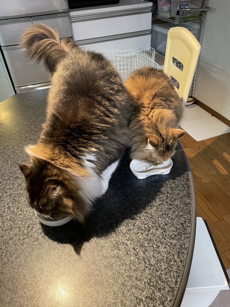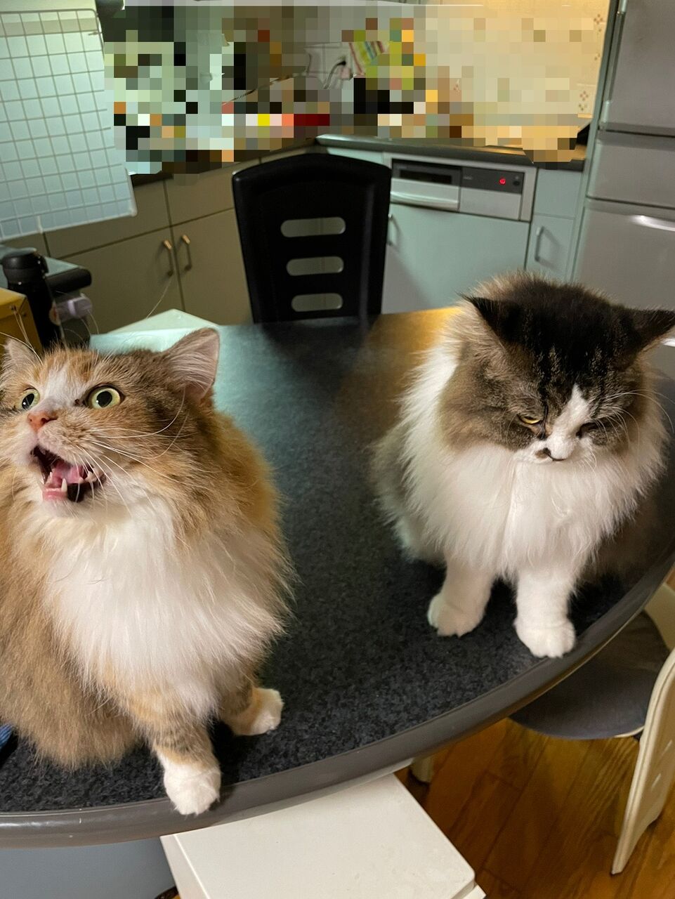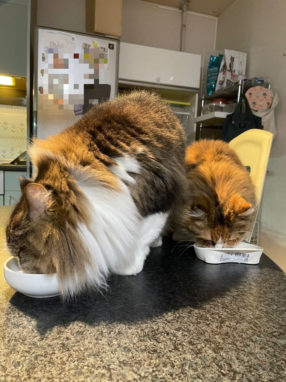 鍋の中のササミからほんのり鶏の匂いがしてくると、ふたりはテーブルの上でそわそわ。あまり鳴かないなぎが、椅子の背に前足を乗せて前のめりに鳴き続ける。